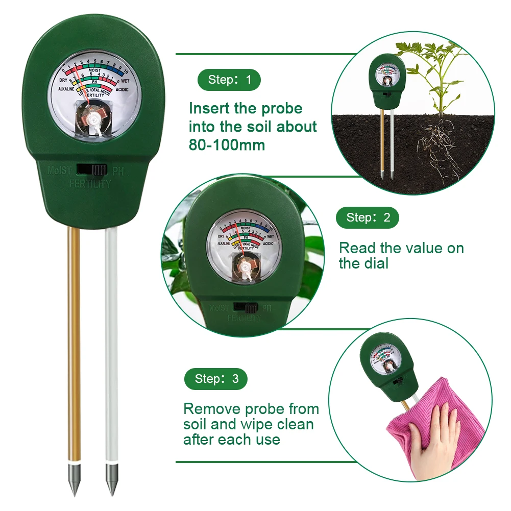 Мини Портативный, цифровой циферблат, широкий интервал, с ясным масштабом на большом цифровом циферблате, более удобное чтение. Он может измерять pH почвы/влажности почвы/плодородие почвы. Двойная конструкция иглы делает обнаружение и анализ почвы более быстрым и точным. В режиме реального времени понимание плодородия почвы и почвы органические вещества и питательные вещества.