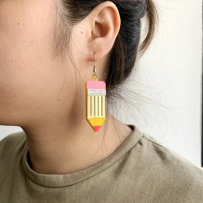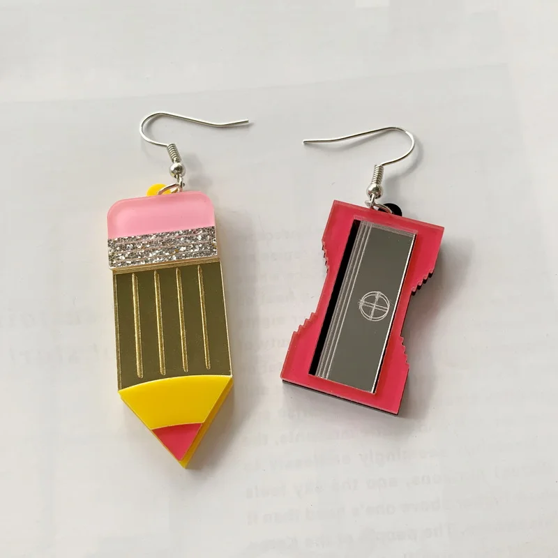 Новое поступление милые желтые розовые карандаши и Точилки акриловые серьги с подвеской зеркальные золотые серебряные канцелярские модные ювелирные изделия подарок