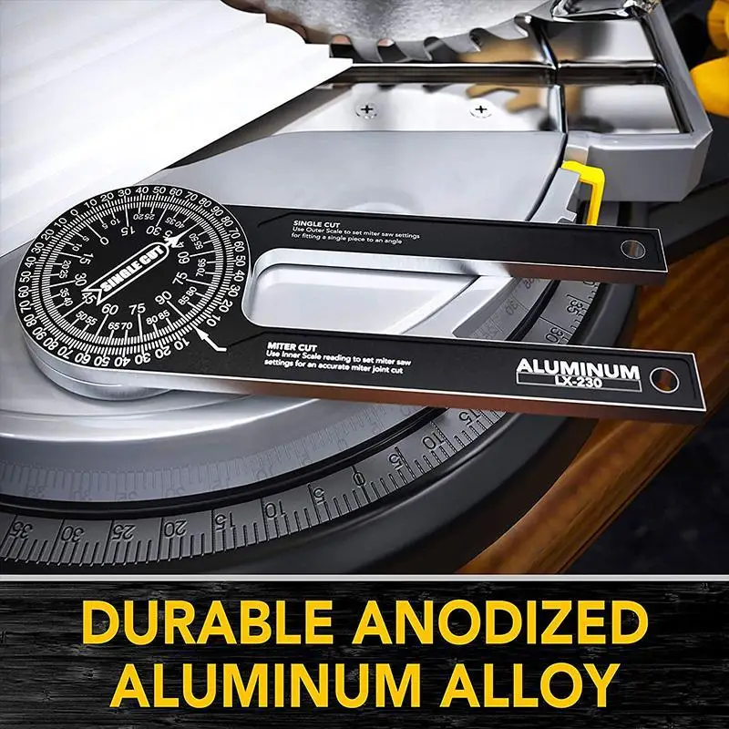 Этот деревообрабатывающий торцовочная пила деления угол измерительный прибор изготовлен из прочного 7-дюймовый упрочненного пластика, это является наилучшим вариантом и сильнее, чем традиционные пластиковый угловой измерительный детекторы. Устойчивый к царапинам и очень прочный. Стрелы и внутренние весы указывают на точный набор торцевой пилы, и точные данные угла можно получить каждый раз.