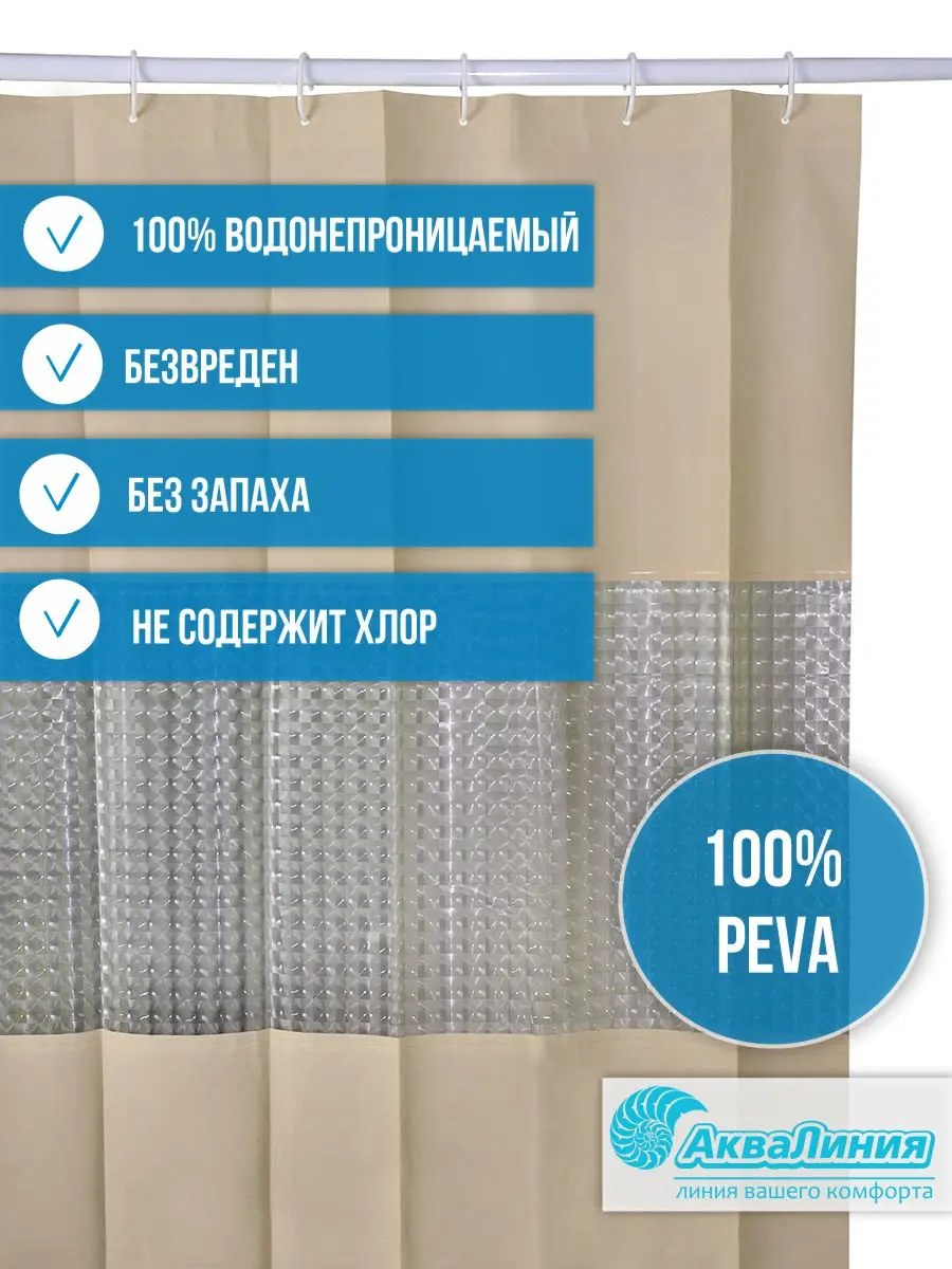 Занавеска для ванной из качественного пластика защитит вашу ванную комнату от брызг и влаги. Штора имеет современный дизайн и прекрасно смотрится в интерьере. Однотонное полотно дополняет оригинальная 3D-вставка, которая помимо декоративной функции имеет еще и способность пропускать свет, что очень удобно в помещениях с небольшим освещением. Материал штор - Пева, абсолютно водонепроницаем и не прилипает к телу. Для крепления на штангу шторка имеет 12 отверстий. Кольца для подвешивания в комплект не входят. Размер: 180 * 200 см.