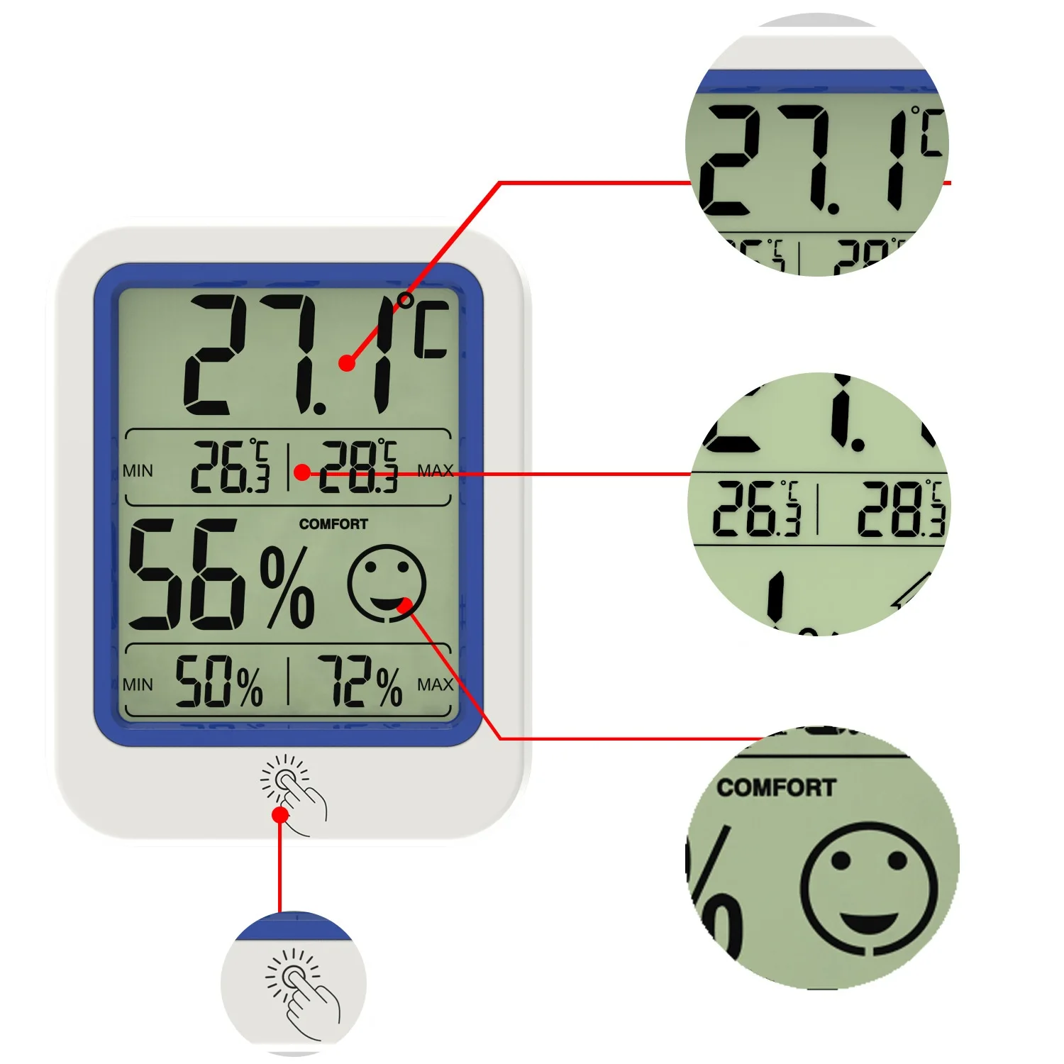 There are two cartoon icons showing you the current weather conditions in real time. Smile face symbolize "Comfortable” (relative humidity: 30%-60%) and crying face means "Unpleasant"(relative humidity: <30% or >60%).