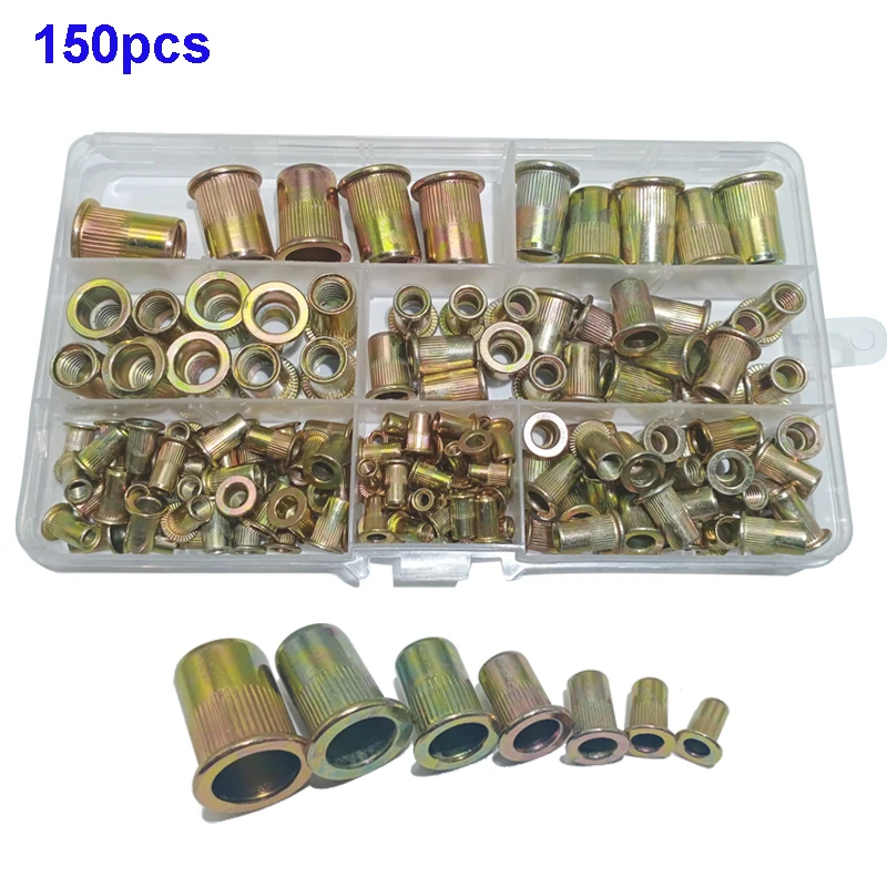 200/150/100 шт Углеродистая стальная заклепочная орехи комплект головы нержавеющая сталь оцинкованная M3 M4 M5 M6 M8 M10 M12 плоской головкой Вставить Rivnut комплект кольца разного размера с коробкой