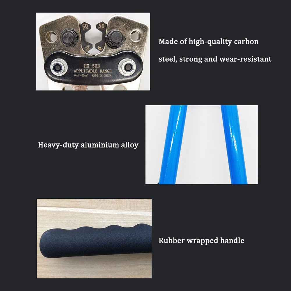 Он имеет обжимную емкость от 6-50 мм ² (аналогично AWG 10, 8,6,4,2,0), обеспечивая быстрое и легкое решение для обжимных клемм, безопасное и надежное.