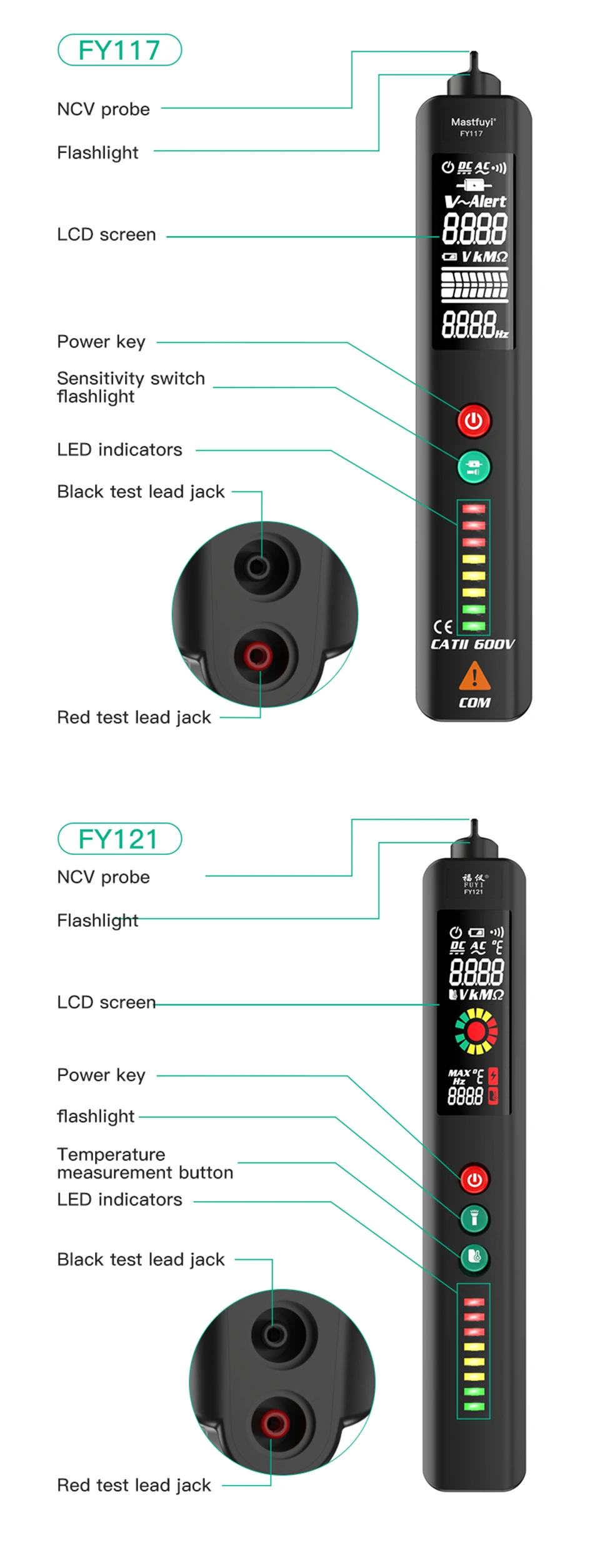 4. Эта серия имеет такие функции, как напряжение постоянного тока переменного тока, сопротивление, Измерение частоты, включение-выключение зуммера, нейтральное и живое различие провода, NCV, регулировка чувствительности, фонарик, автоматическое выключение и т. д. В частности, FY121 имеет функцию бесконтактного инфракрасного измерения температуры.