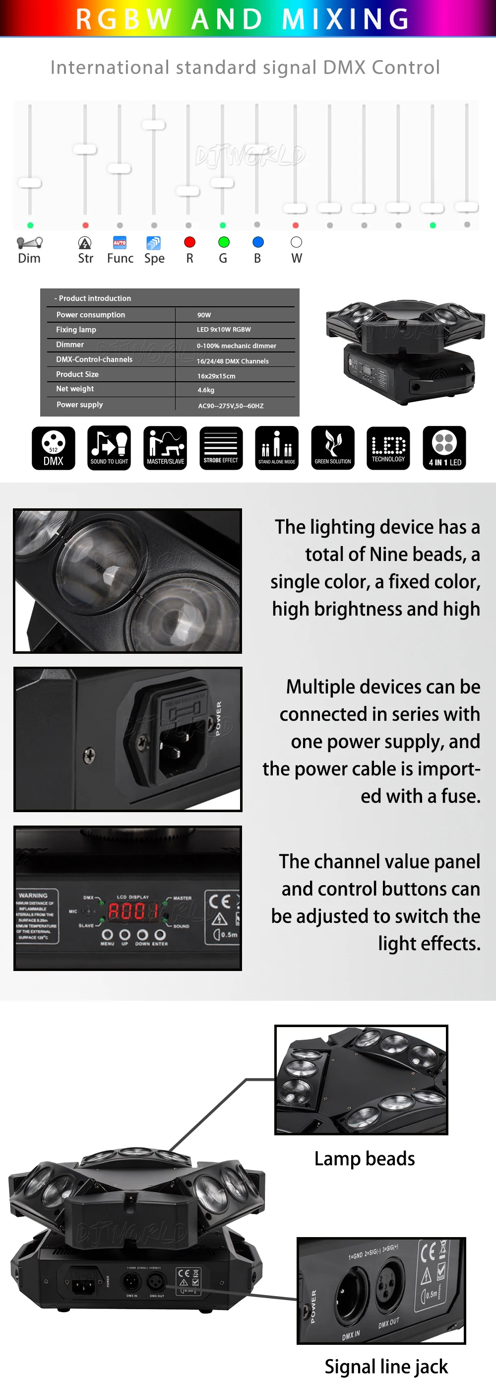 * Режимы управления:DMX512, Авто запуск, звуковое действие, стробоскоп, автономный и мастер/раб, с богатой передовой встроенной программой