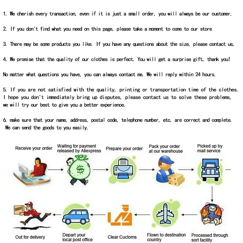 5. Если вы не удовлетворены качеством, печатью или временем транспортировки одежды. Я надеюсь, что вы не сразу поднимаете споры, пожалуйста, свяжитесь с нами, чтобы решить эти проблемы, мы постараемся сделать все возможное, чтобы дать вам лучший опыт.