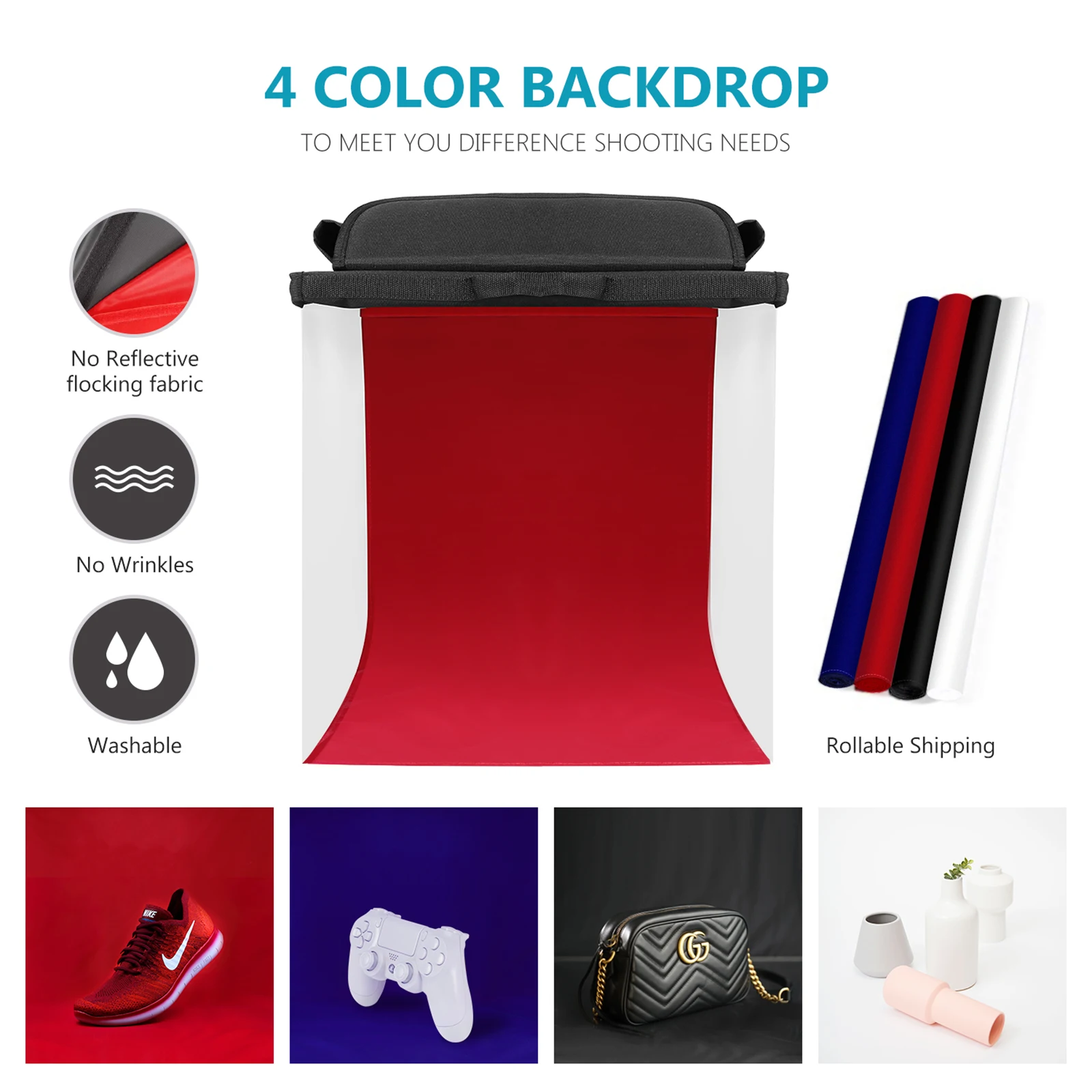 4 цвета фона: поставляется с 4 цветными задниками (черный/белый/синий/красный), и удобно для вас, чтобы установить различные и специальные сцены съемки