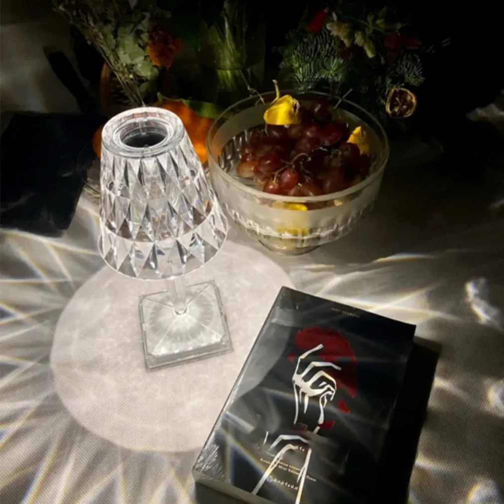 4. Вся настольная лампа изготовлена из акрилового материала, с гладкими линиями и простым дизайном. Алмазная огранка отражает светильник и тени, такие как бриллианты.