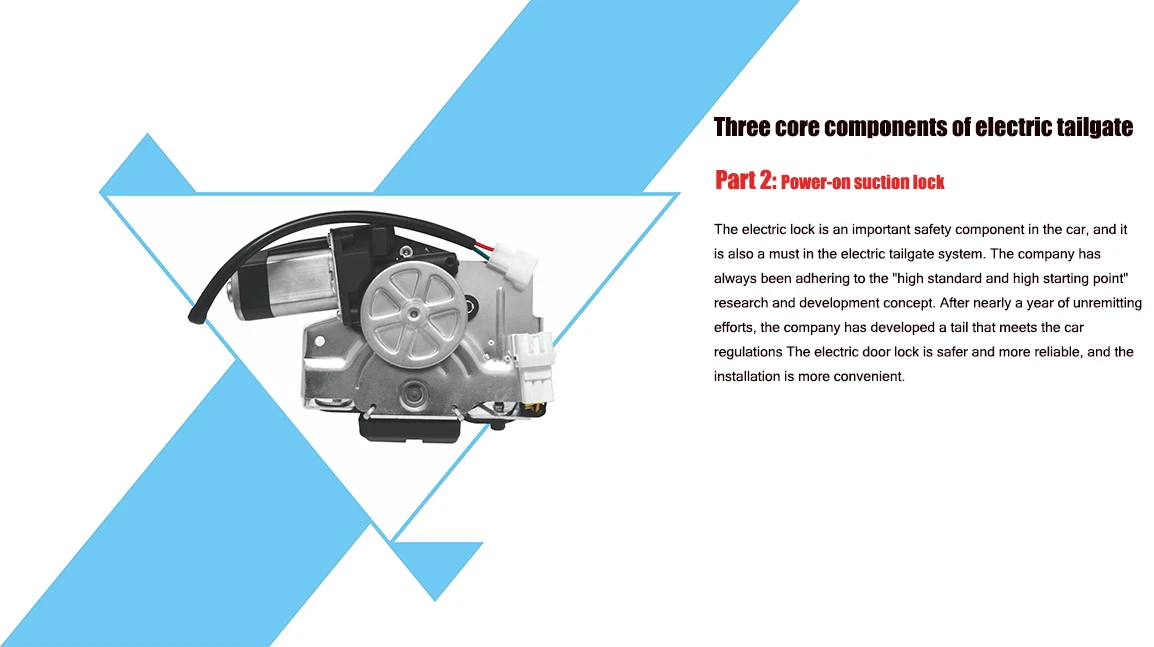Электрический замок является важным компонентом безопасности в автомобиле, а также обязательным элементом электрической системы задней двери. Компания всегда придерживалась концепции исследований и разработок «высокий стандарт и высокая отправная точка». После почти года неустанных усилий компания разработала хвост, который соответствует правилам автомобиля. Электрический дверной замок безопаснее и надежнее, а установка более удобна.