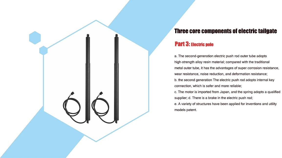 А. Внешняя трубка электрического толкателя второго поколения изготовлена из высокопрочного полимерного материала; По сравнению с традиционной металлической внешней трубкой, она обладает превосходной коррозионной стойкостью, износостойкостью, шумоподавлением, И устойчивость к деформации;