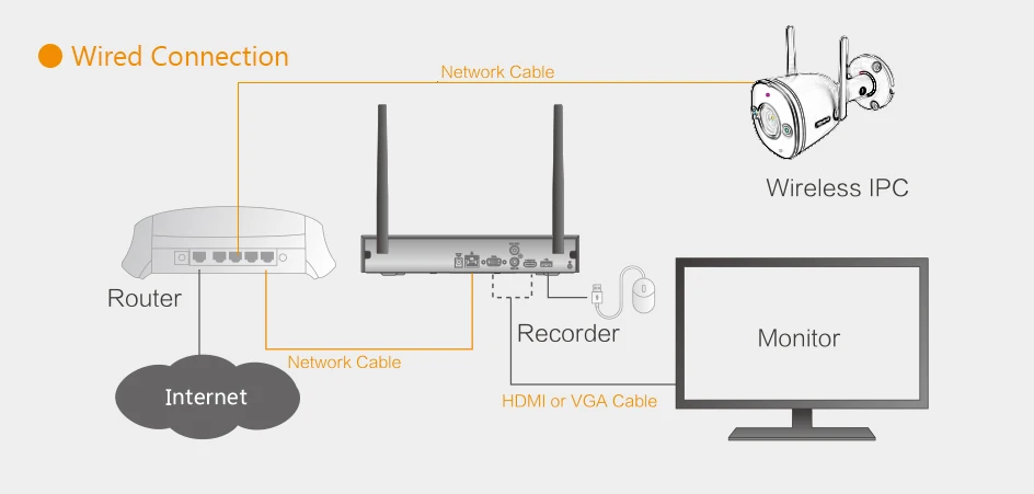 Если вам нужна ip-камера, установленная вдали от NVR, сигналы сильно мешают, вы можете использовать сетевой кабель подключения всех ip-камер к NVR.