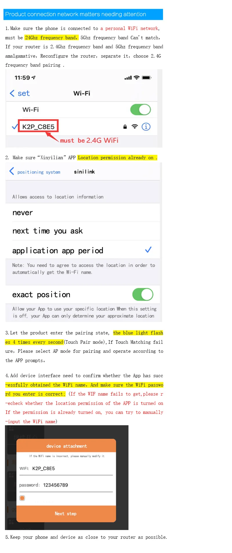 После включения устройства по умолчанию он войдет в режим сенсорного сопряжения. Если сопряжение не удается, выберите режим AP, подключитесь к сети Wi-Fi «продукт sinilink» с паролем «12345678» и работайте в соответствии с подсказкой приложения.
