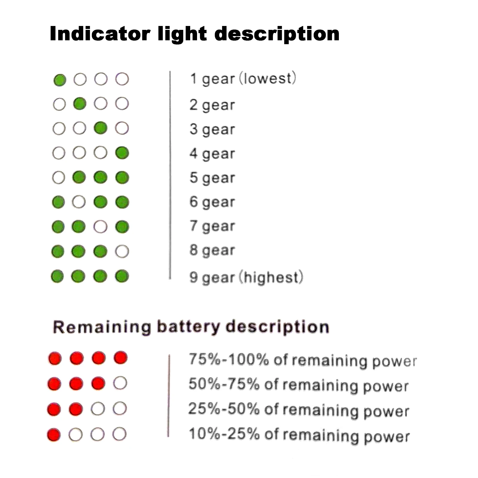 1 красный светильник (10-25% оставшегося электрического количества), 2 красный светильник s (25-50% оставшегося электрического количества), 3 красный светильник s указывает (50-75% оставшегося электрического количества), 4 Красный светильник s указывает (75-100% оставшегося электрического количества).