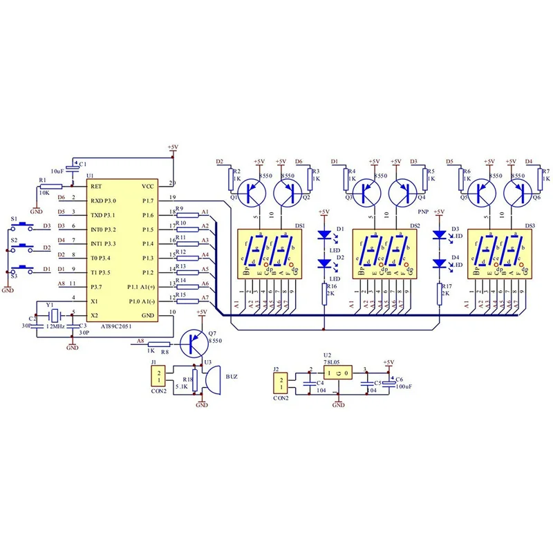 Он запрограммирован чип MCU AT89C2051, точный дисплей времени, формат 24 часов, поддержка коррекции секунд, часы обратного отсчета, секундомер, счетчик, ежечасный сигнал и функции будильника. Высококачественная печатная плата, четко маркировала электронные компоненты, Даже новички могут легко паять.