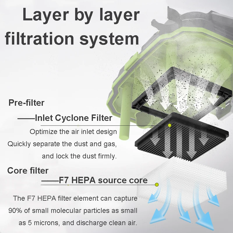 Фильтрующий элемент F7 HEPA может улавливать 90% мелких молекулярных частиц как маленькие, как 5 микрон, и очищать воздух.