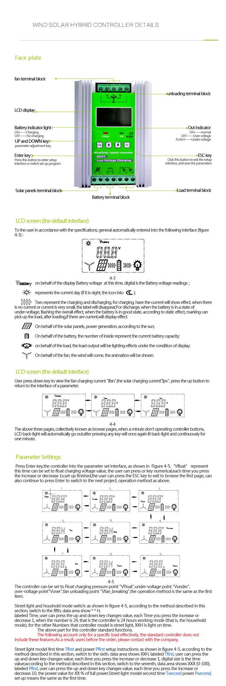 Контроллер разработан специально для гибридной ветровой солнечной системы уличный светильник, который может сделать Ветер солнечный гибридный уличный светильник системы различных ресурсов для достижения лучшей конфигурации, конечно, контроллер с некоторыми простыми настройками также может использоваться в бытовой системе.