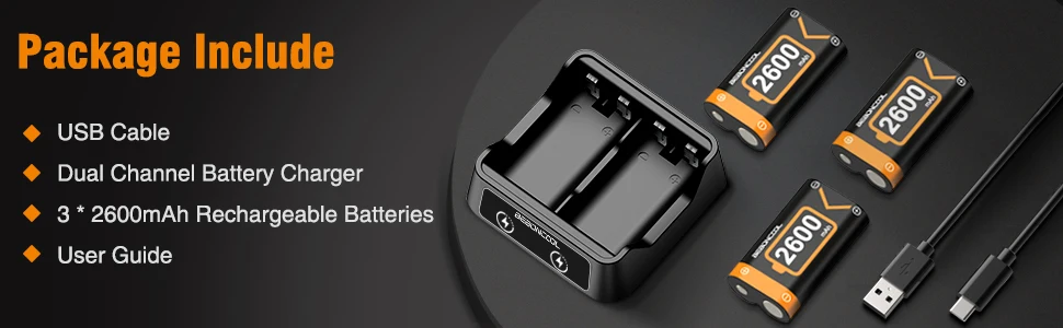 Это зарядное устройство для контроллера Xbox one аккумулятор поставляется с 3 шт 2600mAh перезаряжаемые аккумуляторы с контроллером для Xbox серии X | S/ Xbox One X/ Xbox One Elite контроллеры