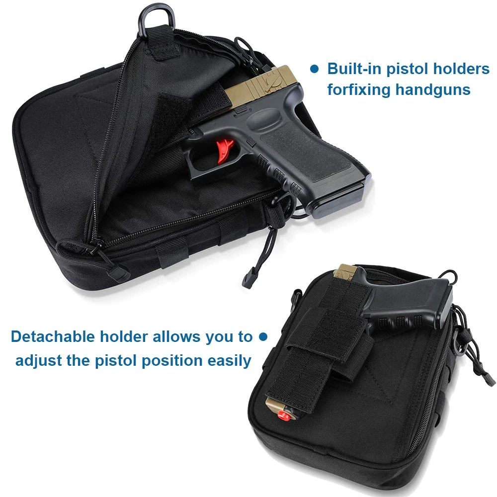 3. Размеры сумки для пистолета: 9x7 дюймов; Достаточно для хранения пистолета, журналов, боеприпасов, снаряжения для дробовика, аксессуаров для дальности действия и т. д.
