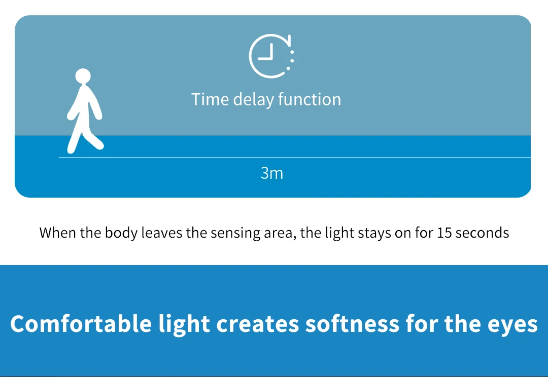 * Мягко осветляет, не ослепляет, максимальное расстояние зондирования 5 м, непрерывный светильник 15 секунд