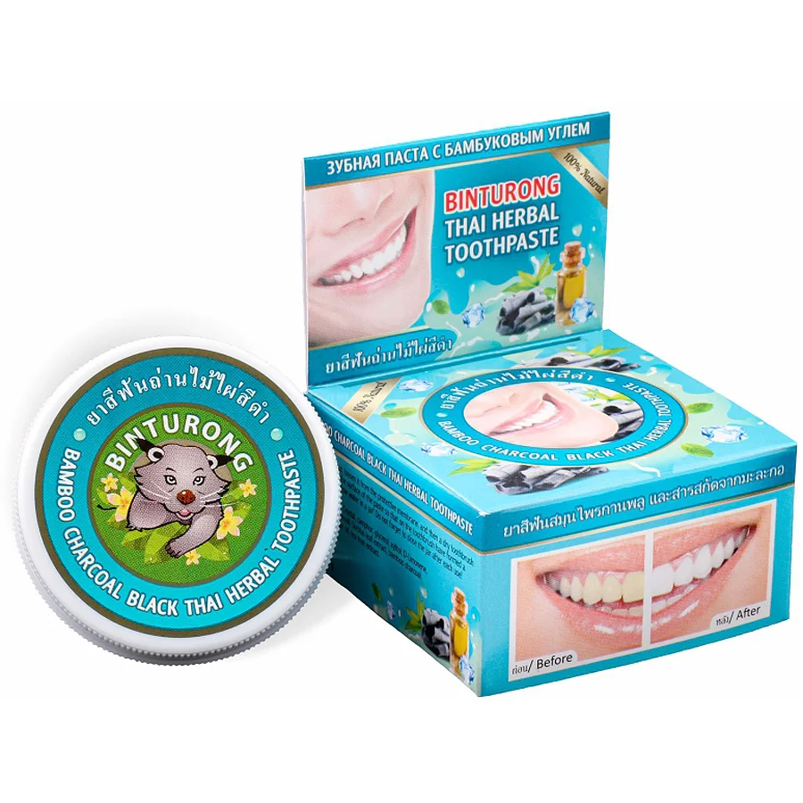 Зубная паста с бамбуковым углем. Зубная паста с натуральными экстрактами и бамбуковым углем обладает бактерицидными свойствами, выводит токсины. Хорошо отбеливает зубы и устраняет неприятный запах во рту. Экстракт стреблюса Asper leaf помогает уменьшить воспаление десен, удалить зубной камень и налет, хорошо удаляет бактерии. Одной банки зубной пасты достаточно для 3 месяцев регулярного использования.