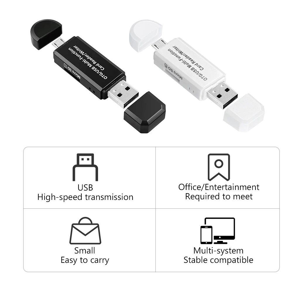 Устройство для чтения карт памяти USB 2.0 имеет стандартный разъем USB 2,0 (тип A) и разъем micro USB (тип B). Передача файлов, фотографий, видео с tf-карты/sd-карты на ваш ПК, телефоны Android, поддерживающие функцию OTG.