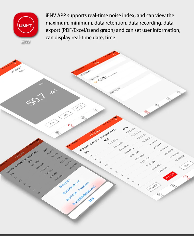 UT353BT Мини цифровой измеритель уровня звука может преобразовывать окружающий звук в электрические сигналы, обрабатывать данные и отображать результаты на ЖК-дисплее. Он может постоянно контролировать окружающий звук, UT353BT использует bluetooth для передачи данных и анализа, хранения, экспорта через мобильное приложение UNI-T (iENV).