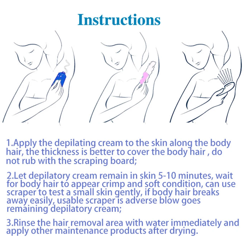 1. Нанесите депиляционный крем на кожу вдоль волоса тела, толщина лучше, чтобы покрыть волосы тела, не натирайте соскабливающая доска;