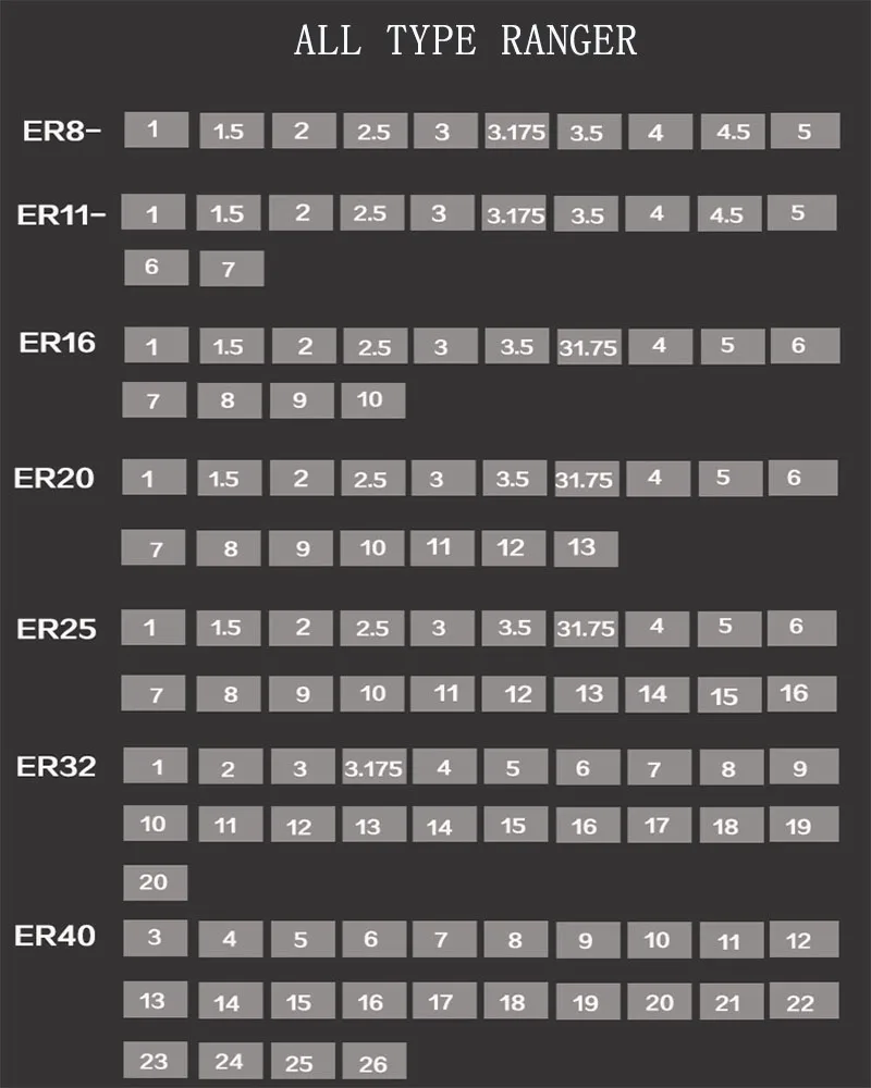 Одна и та же модель имеет множественную точность, ER Цанга включает в себя 4 разновидности точности (0,003, 0,005, 0,008, 0,015), точность настоящего продукта составляет 0,015.