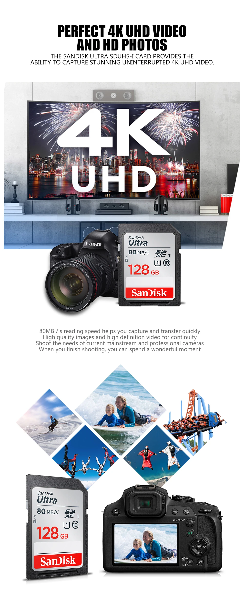 (2) благодаря UHS-I картам SanDisk Ultra SDXC вы получите более быструю загрузку, высокую производительность и производительность, чтобы запечатлеть и сохранить 64 Гб высококачественных фотографий и видео в формате Full HD.