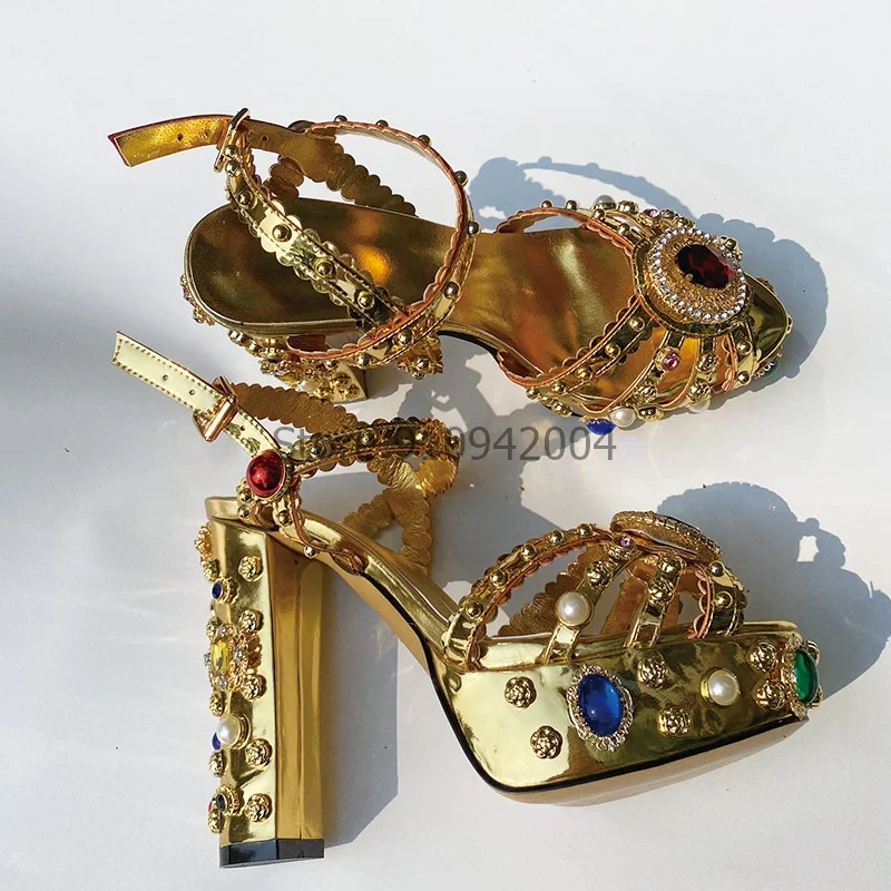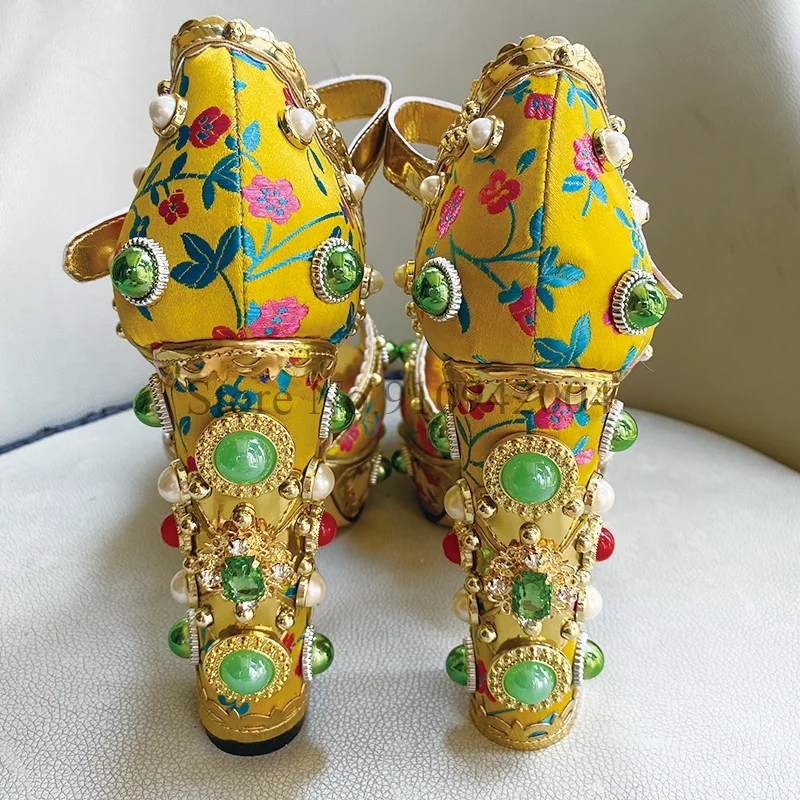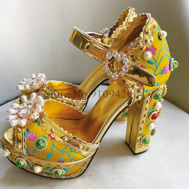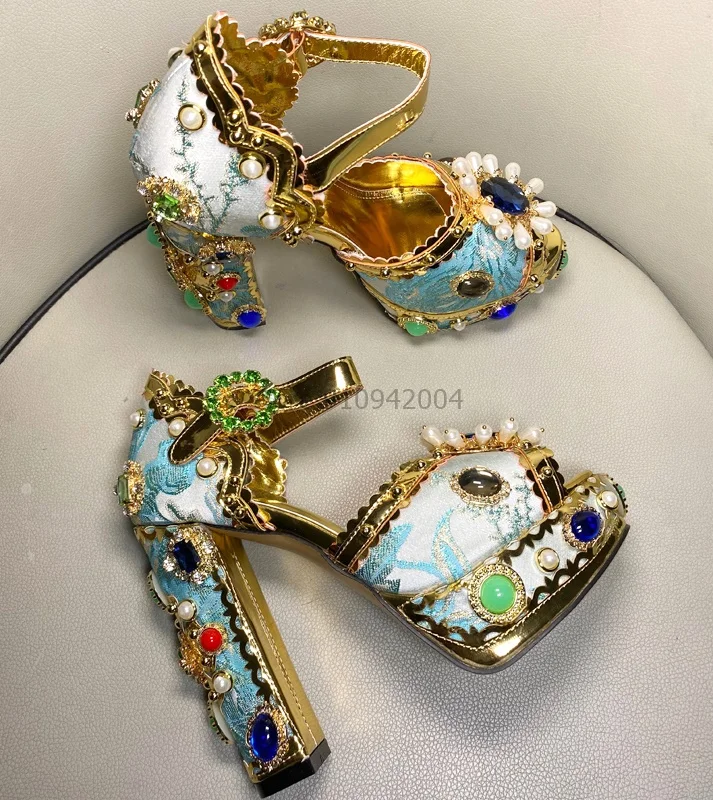 Роскошная Свадебная обувь на платформе со стразами; Женские босоножки на массивном каблуке с ремешком на щиколотке и вышивкой из атласа, Украшенные бусинами и заклепками