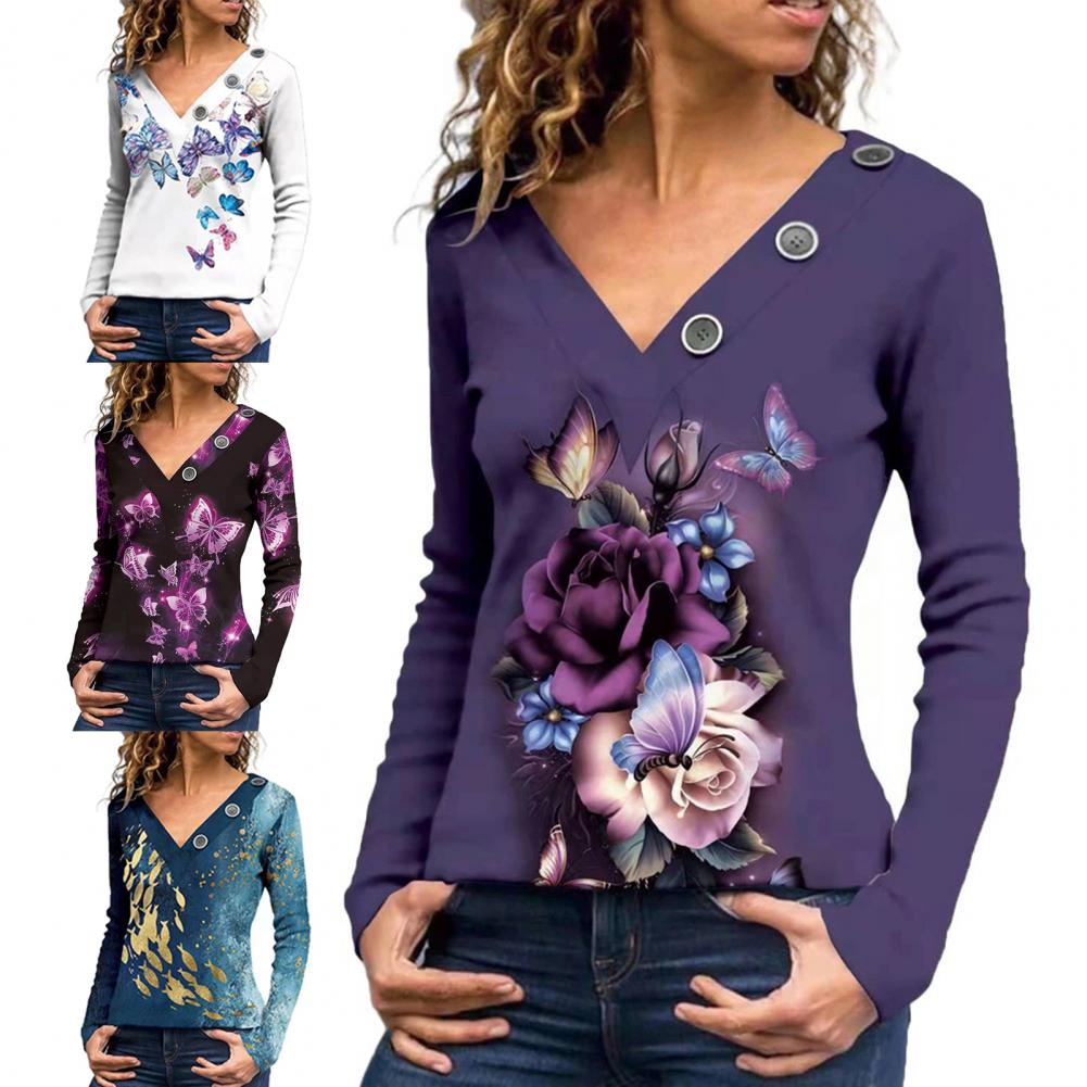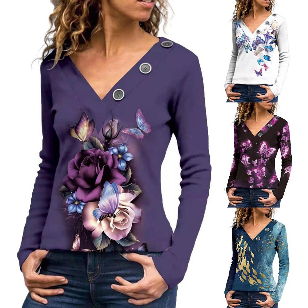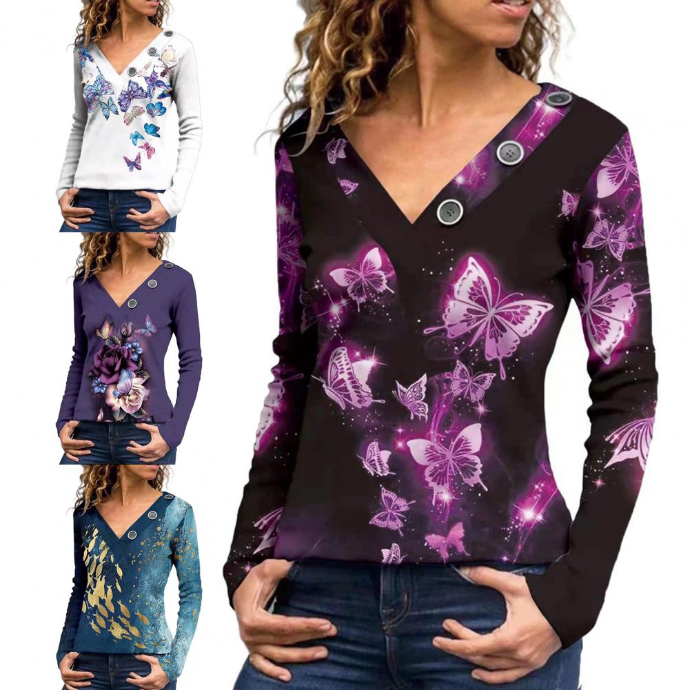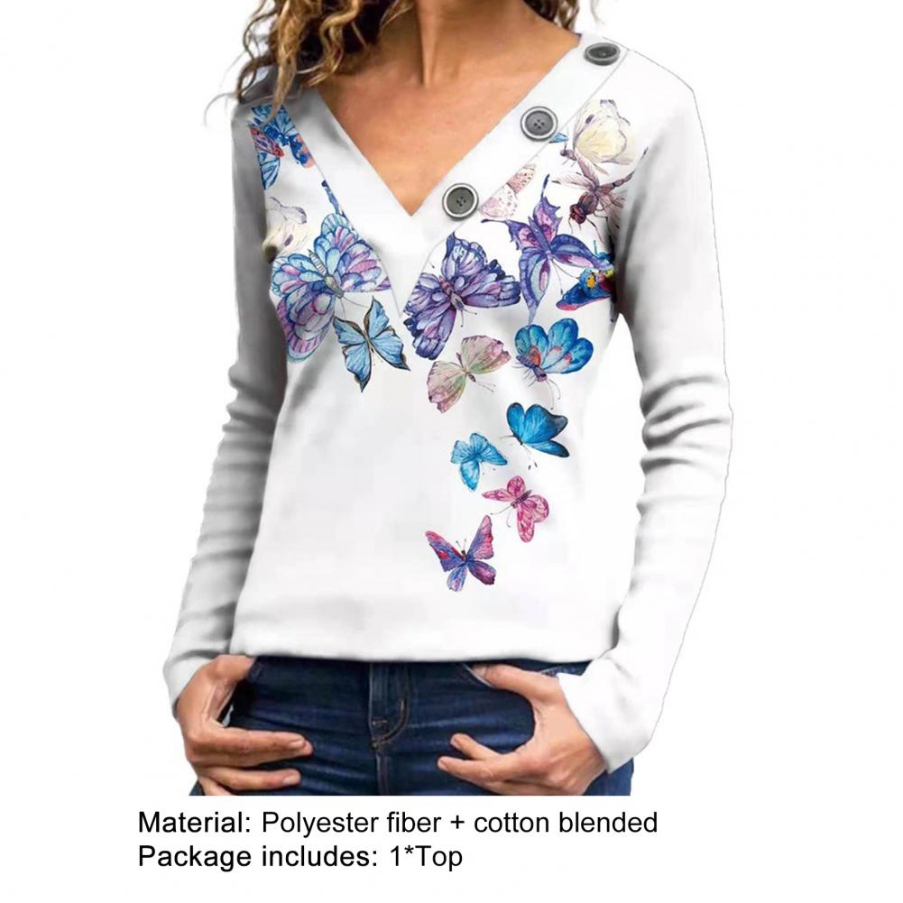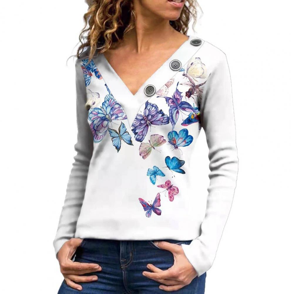 Классическая женская блузка с длинным рукавом, дышащая Осенняя туника с принтом бабочек и v-образным вырезом, верхняя уличная одежда
