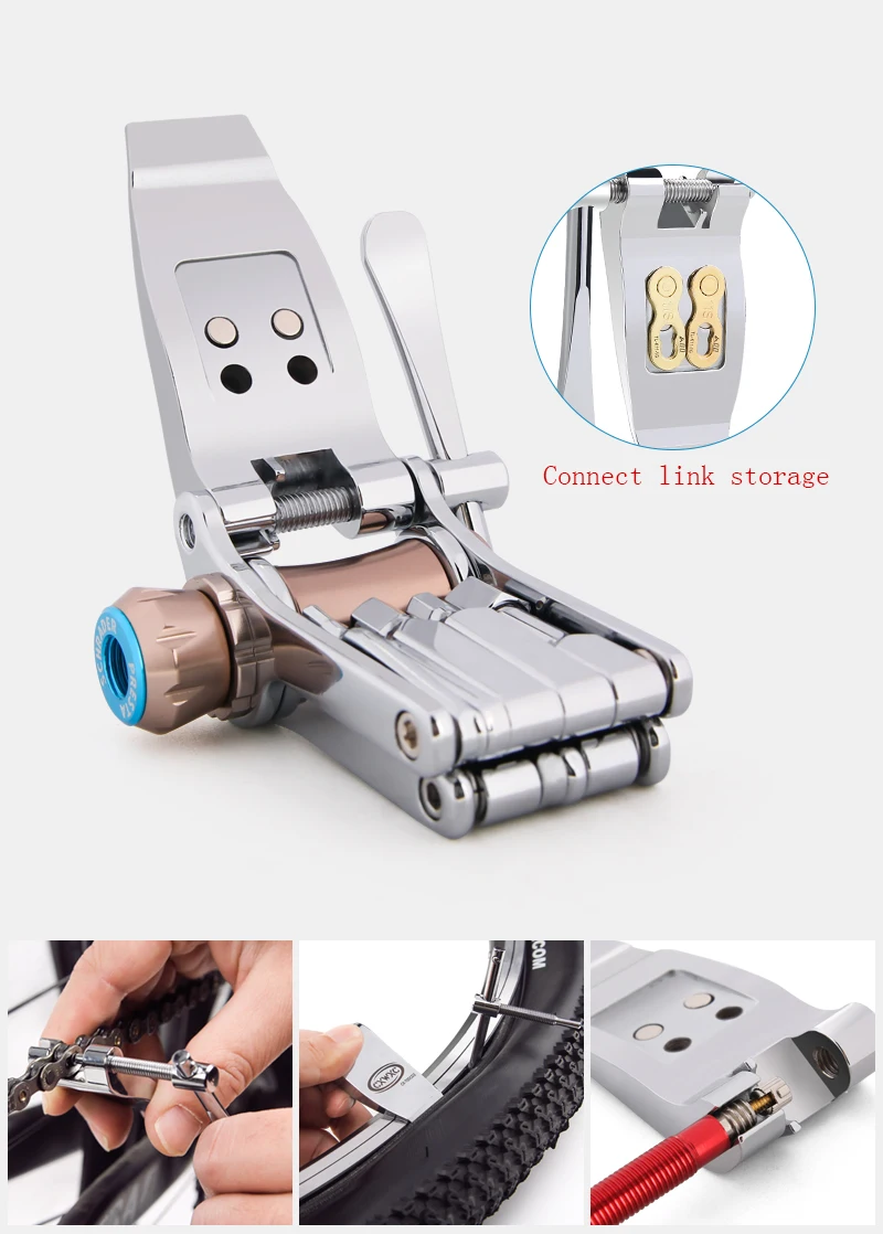 [16 в 1 инструмент для ремонта велосипедов]: особенности 2, 2,5, 3, 4, 5, 6 и 8 мм шестигранные ключи, Torx T25, отвертка flathead, отвертка Phillip, цепной выключатель, инструмент с сердечником клапана presta, 2 рычага для шин, устройство для хранения звеньев цепи и адаптер картриджа CO2