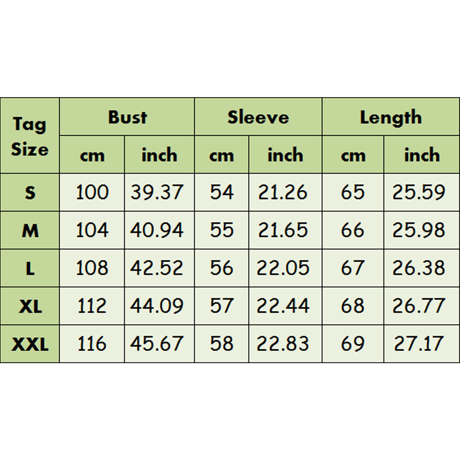 Размеры Бюст Рукав Длина S 100 см/39,37'' 54 см/21,26'' 65 см/25,59'' М 104 см/40,94'' 55 см/21,65'' 66 см/25,98'' L 108 см/42,52'' 56 см/22,05'' 67 см/26,38'' XL 112 см/44,09'' 57 см/22,44'' 68 см/26,77'' XXL 116 см/45,67'' 58 см/22,83'' 69 см/27,17''