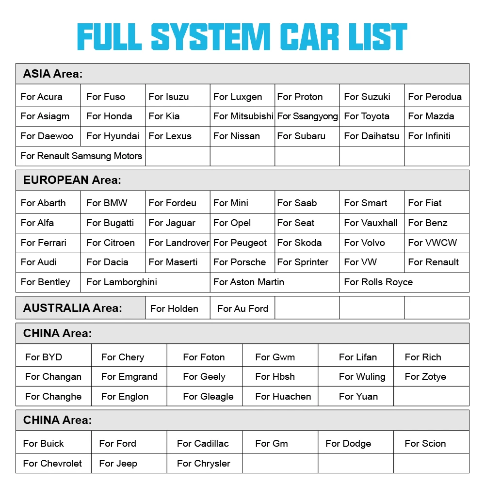 Для ACURA, для ASIAGM, для DAEWOO, для DAIHATSU, для FUSO, для HONDA, для HYUNDAI, для INFINITI, для ISUZU, для KIA, для LEXUS, для MAZDA, для LUXGEN, для MITSUBISHI, для NISSAN, для PERODUA, для PROTON, для Renault Samsung Motors, для SSANGYONG, для SUBARU, для SUZUKI, для TOYOTA,