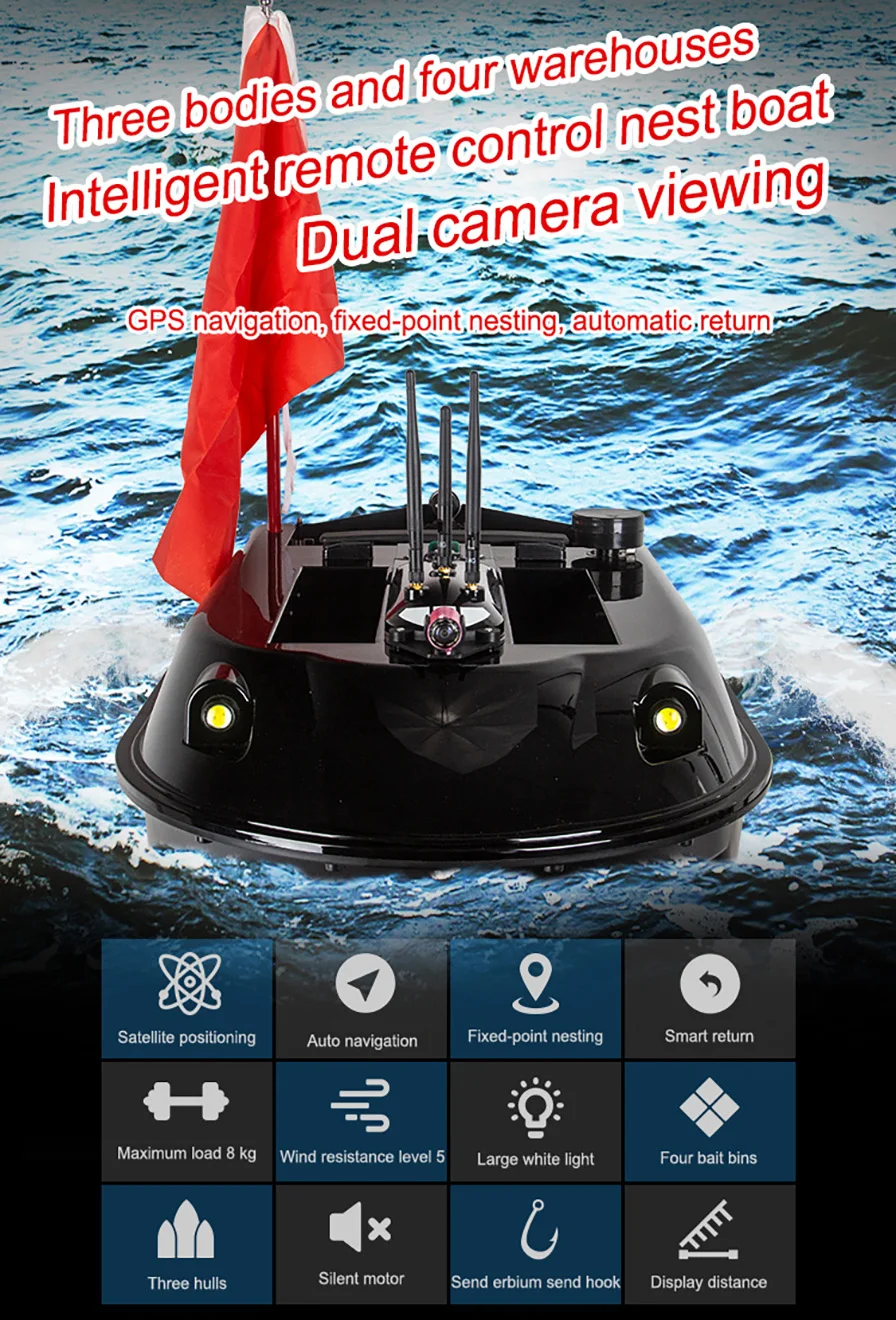 Версия GPS: принятие глобального GPS позиционирования, может установить четыре точки приманки и эффективно привлечь рыбу. Когда корпус выходит из строя или аккумулятор не работает, он автоматически вернется, чтобы ваша любимая лодка была в безопасности.
