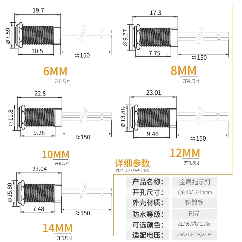 Длина провода: 6 мм световой светильник с 15 мм длинной проволокой, другие размеры без провода.