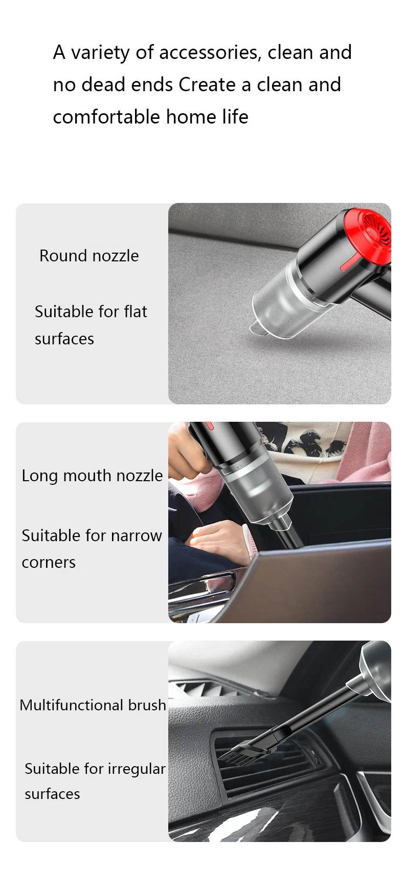 【 3 вида аксессуаров, чистый без мертвых концов 】Ручной пылесос поставляется с 3 видами аксессуаров. Щелевая насадка для узких зазоров, углов. Насадка-щетка для ковров и волос. Аксессуары для вакуумной перекачки и надувные аксессуары удовлетворят ваши Многочисленные потребности.