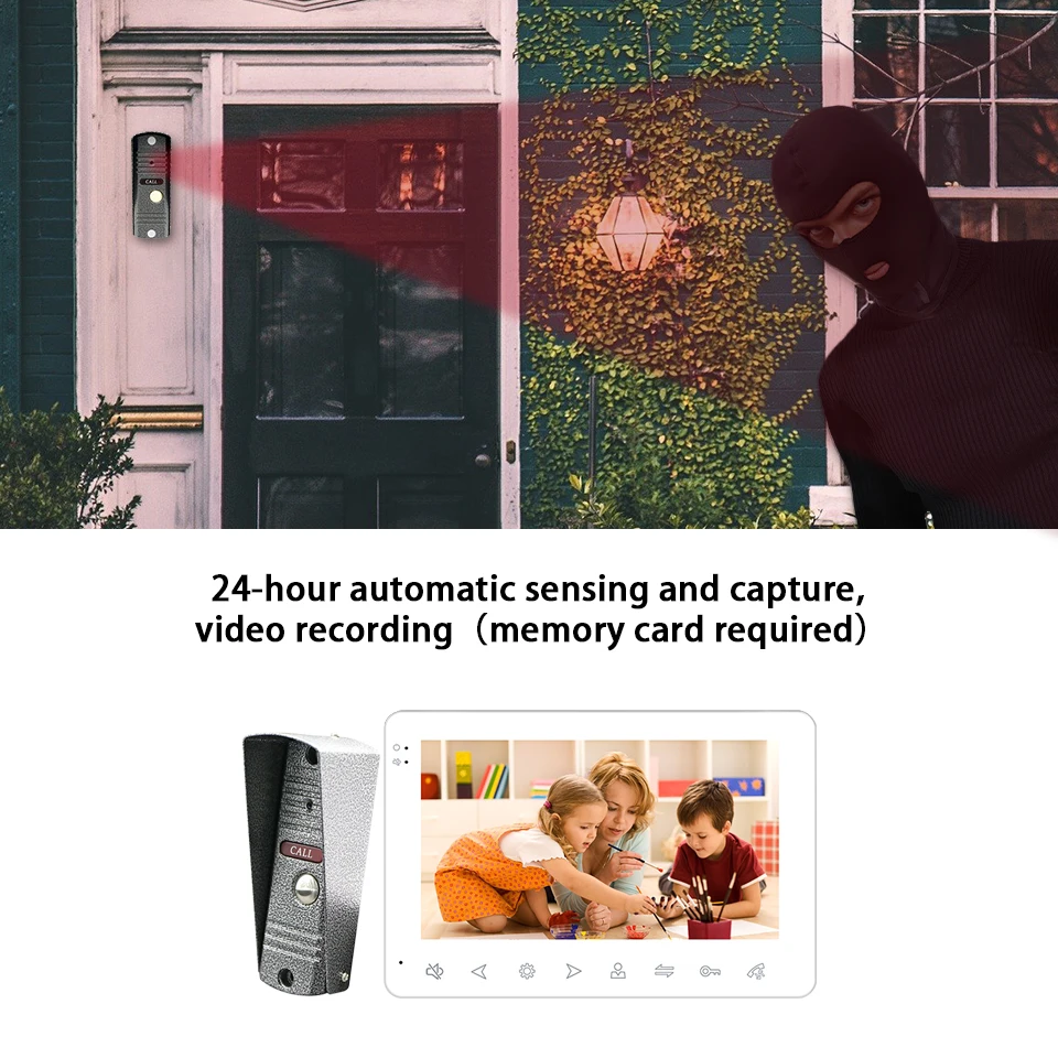 Внутренний блок имеет ультраузкую рамку, высококлассную и красивую, с кнопками сенсорного типа, что делает работу более легкой и гладкой. Дверной блок изготовлен из металлической панели, которая является прочной и антиокислительной. С 7 "Проводной видео-дверной телефонной системой, посетитель может использовать Вызов панели вызова, затем вы используете крытый монитор разблокировки, мониторинга, фотографирования и записи видео.