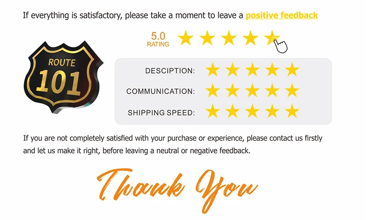 1. Ваше удовлетворение и положительные отзывы очень важны для нас. Пожалуйста, оставьте положительные отзывы и 5 звезд, если вы удовлетворены нашими товарами и услугами. Кроме того, мы также оставим вам положительные отзывы 5 звезд.