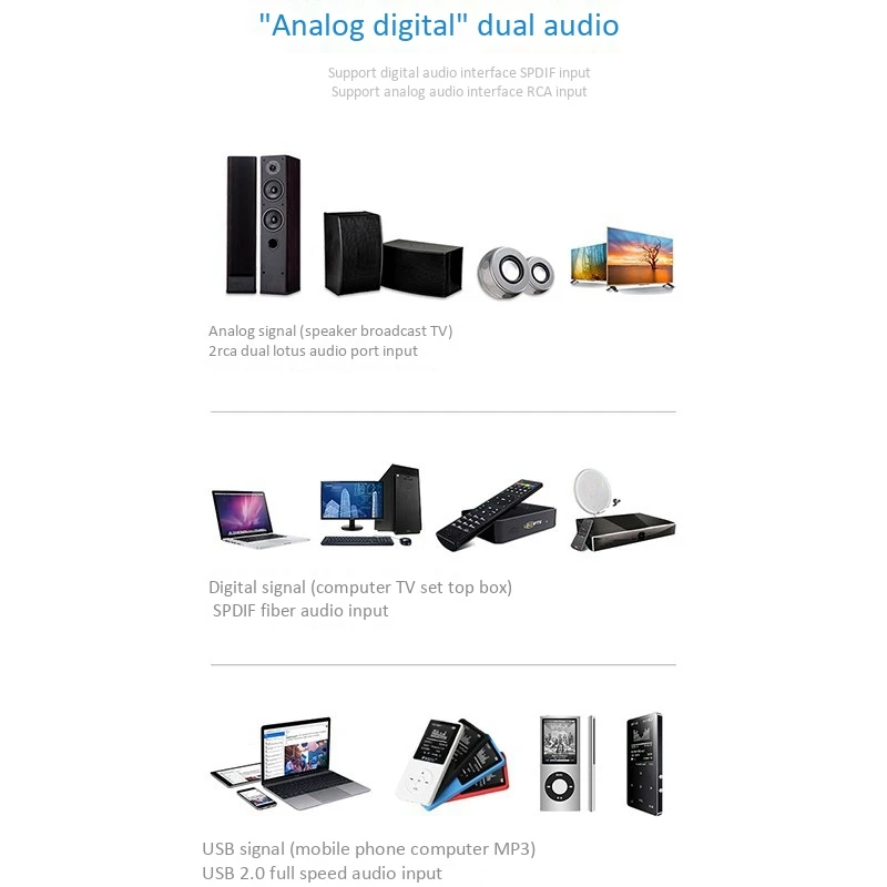 3. "Аналоговый Цифровой" двойной аудио, поддержка цифрового аудио интерфейса SPDF вход, поддержка аналогового аудио интерфейса RCA вход, USB2.0FuL- Speed аудио вход