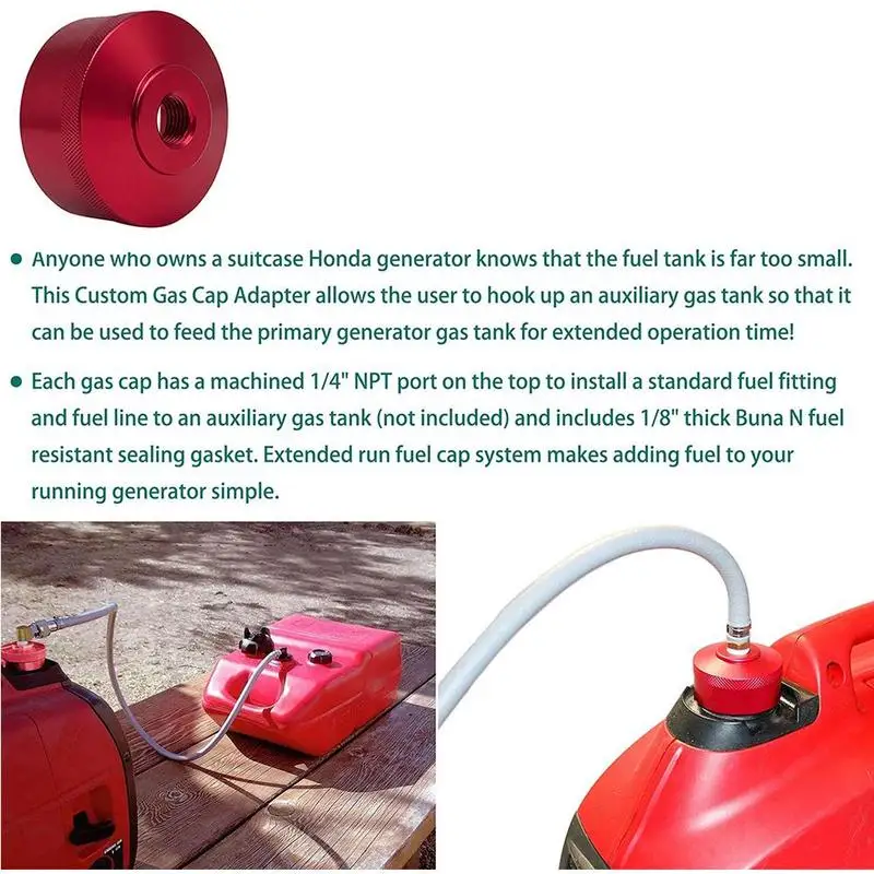 Расширенная Рабочая газовая крышка: те, кто владеет генераторами Honda, знают, что топливный бак слишком мал. Этот изготовленный на заказ адаптер крышки газа позволяет пользователям подключить вспомогательный газовый бак так, что он может быть использован, чтобы дать основному генератору бензобака больше времени работы!