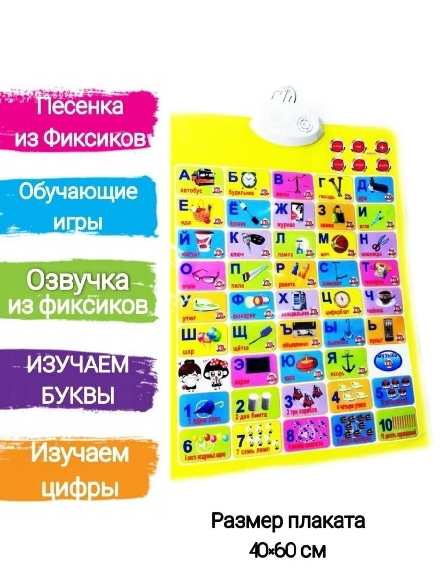 Обучающий плакат. В процессе изучения азбуки по данному обучающем плакату ваш ребенок научится отличать гласные от согласных, выучит алфавит, простой счет до 10, а также натренирует свою память, запоминая веселые четверостишья про животных, изображенных рядом с каждой буквой. Такие плакаты, как ферма, зоопарк, морской мир, лесные животные впечатлят не только ребенка но и взрослого! ПОЖАЛУЙСТА, обратите внимание, что в плакат вставляются 3 (!!!!!) батарейки типа ААА. Одна уходит вглубь. Её не видно будет. НУЖНО ПРОСТО ВСТАВЛЯТЬ БАТАРЕЙКИ!