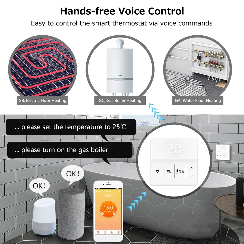 Пульт дистанционного управления и Голосовое управление без рук позволяют легко управлять термостатом через Wi-Fi соединение 2,4G. И вы также можете связать несколько термостатов вместе как группу и управлять ими одновременно.