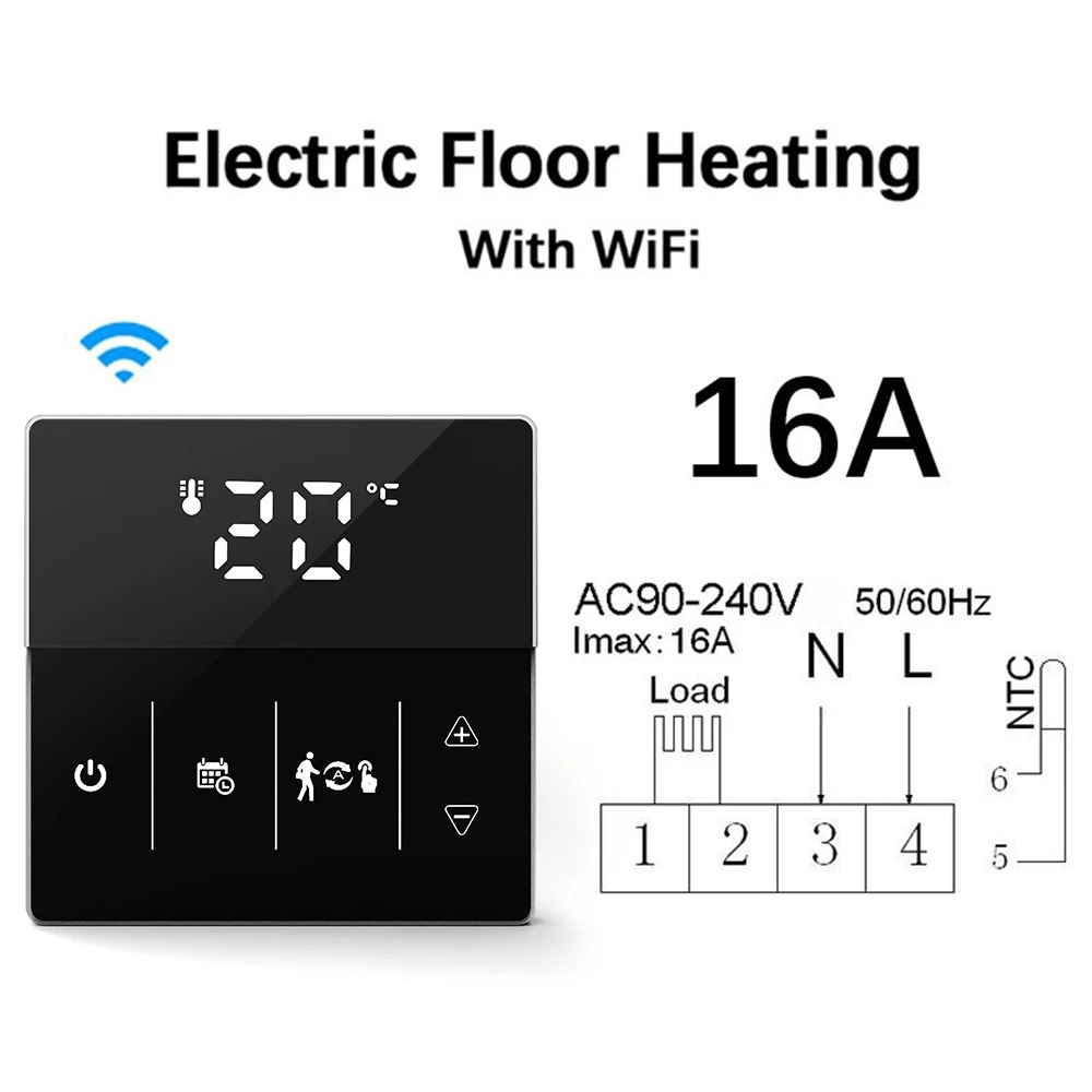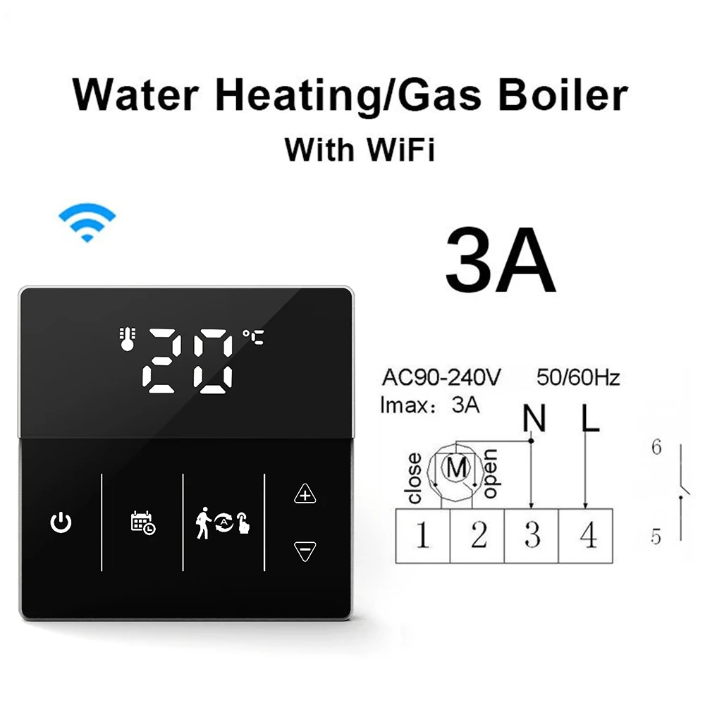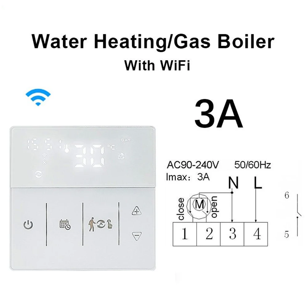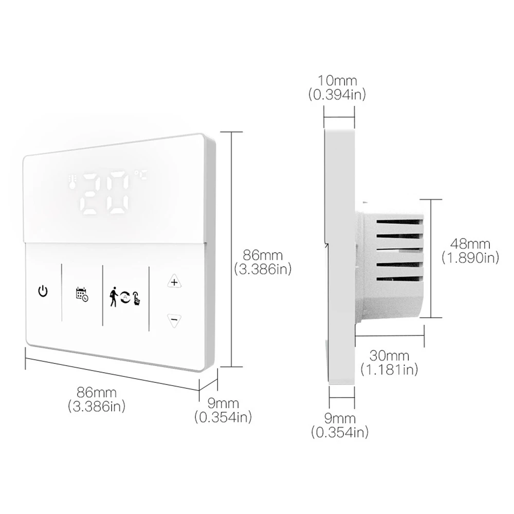 86*86 мм стандартный размер, умный термостат может быть установлен на стене и используется для управления электрической системы напольного отопления (16A) или Газового Котла отопления и водного пола системы отопления (3A).