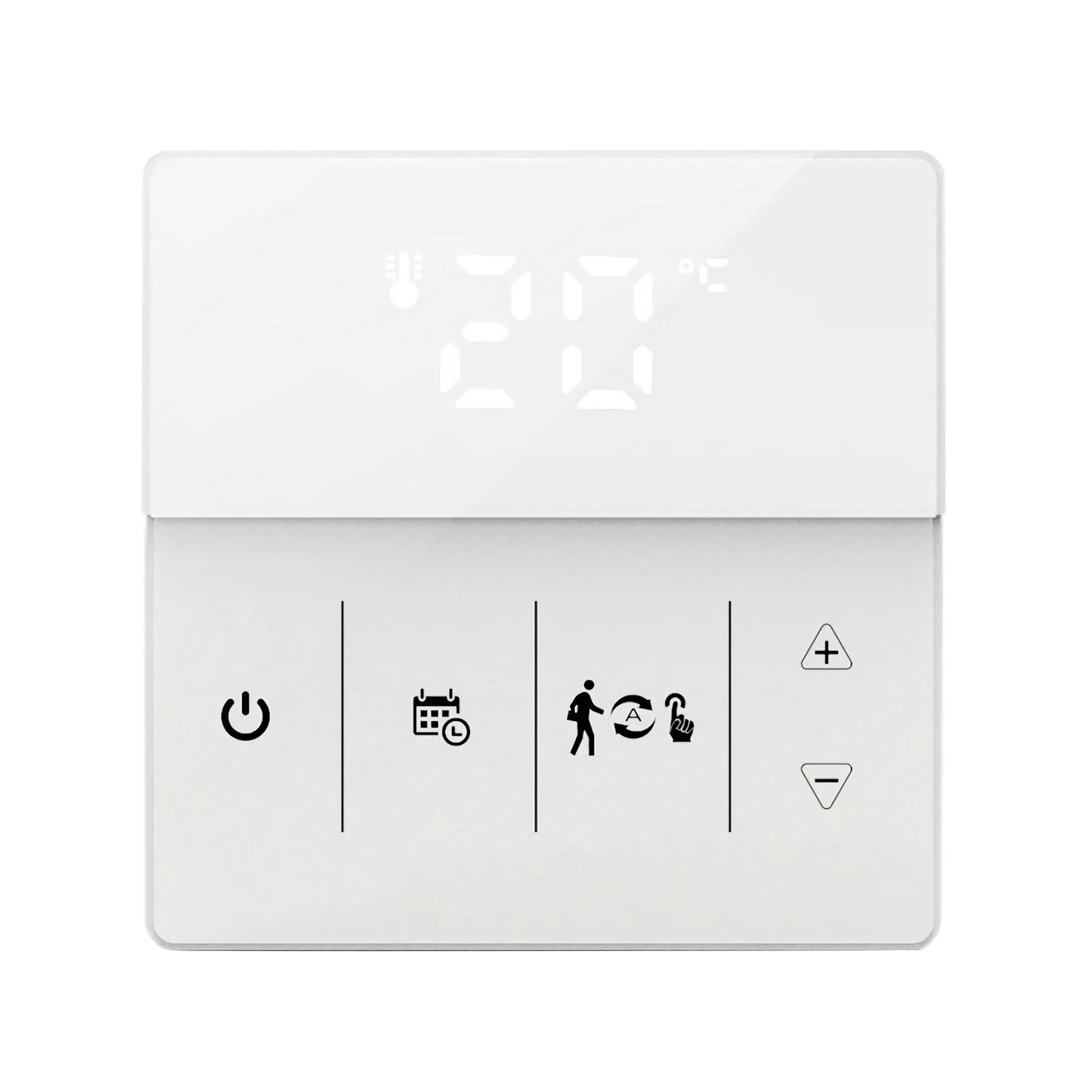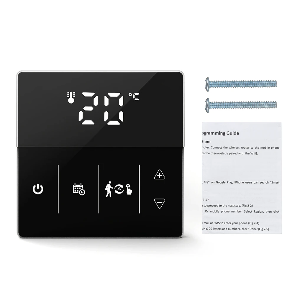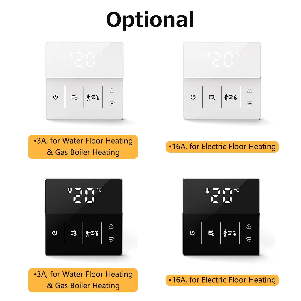 86*86 мм стандартный размер, умный термостат может быть установлен на стене и используется для управления электрической системы напольного отопления (16A) или Газового Котла отопления и водного пола системы отопления (3A).