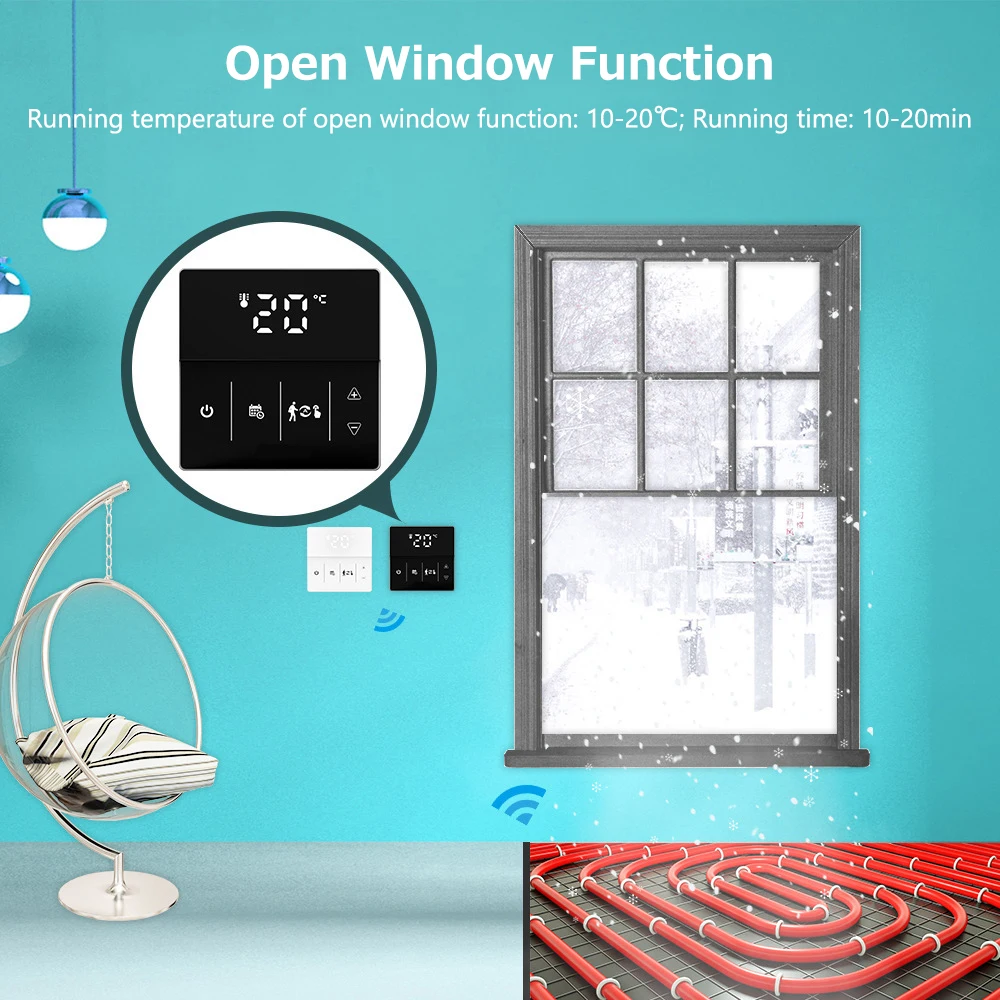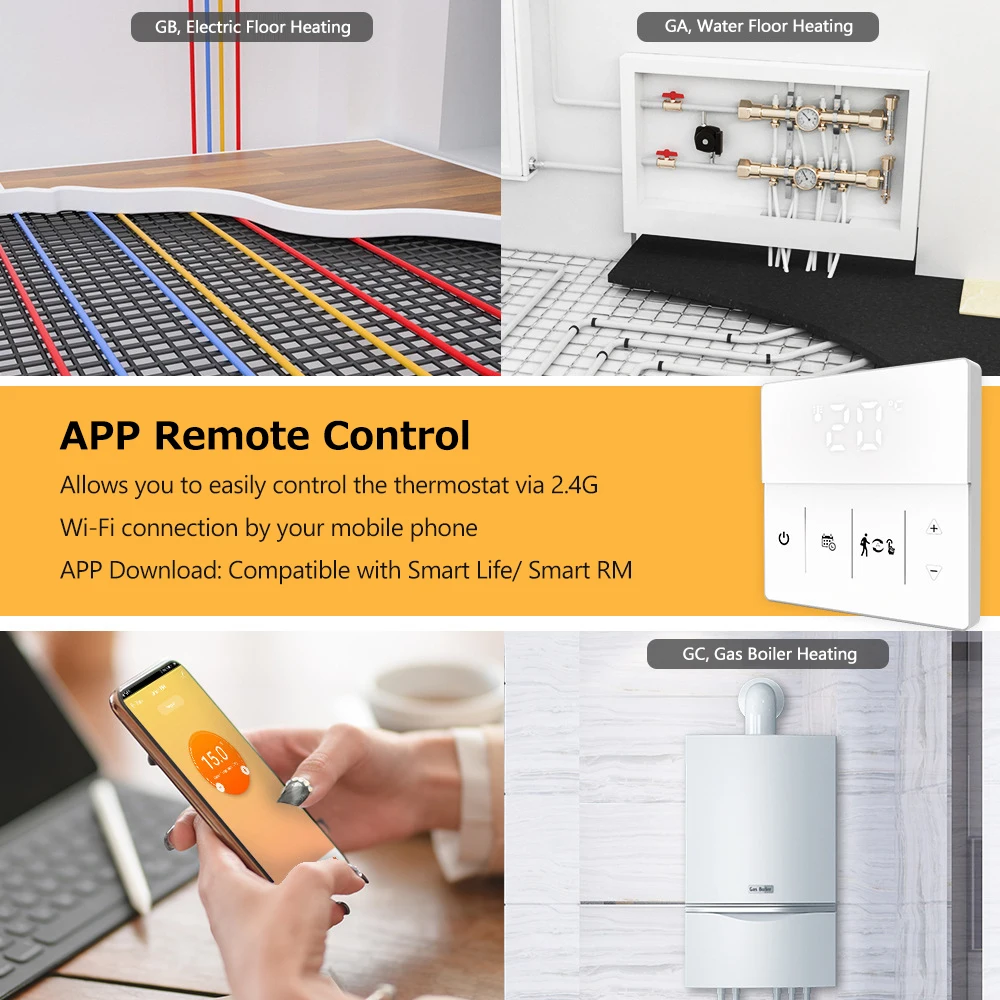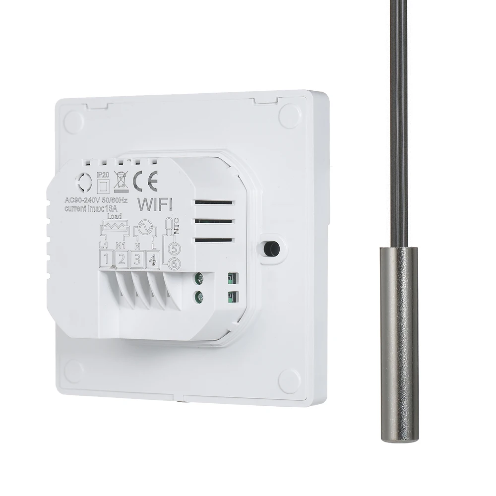 Умный термостат может использоваться для управления электрической системой напольного отопления или системой отопления газового котла и водного напольного отопления. Внутренний датчик измеряет температуру в помещении, а внешний датчик (для электрического напольного отопления) измеряет температуру пола для защиты от высоких температур, чтобы предотвратить выгорание нагревательного устройства из-за высоких температур. С интеллектуальным контролем температуры, это идеальный термостат для дома!