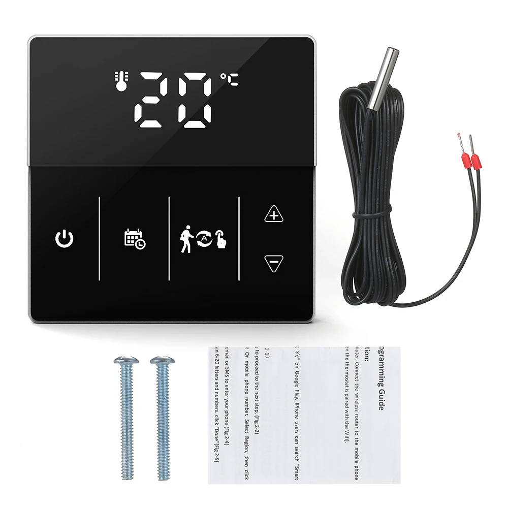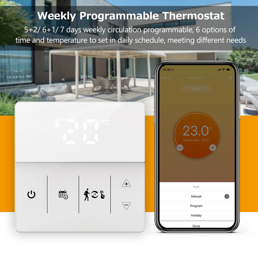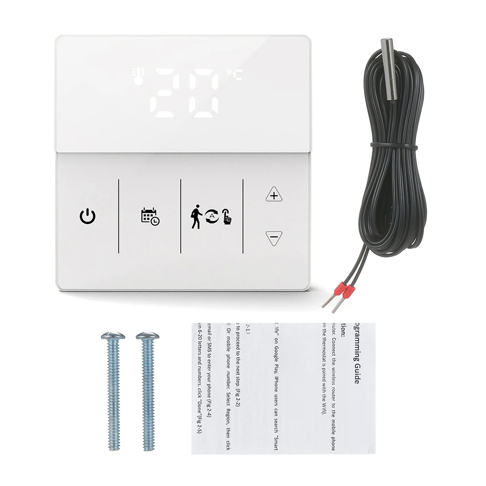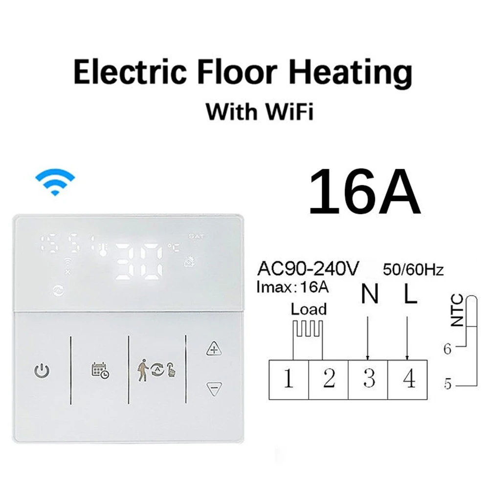 Умный термостат может использоваться для управления электрической системой напольного отопления или системой отопления газового котла и водного напольного отопления. Внутренний датчик измеряет температуру в помещении, а внешний датчик (для электрического напольного отопления) измеряет температуру пола для защиты от высоких температур, чтобы предотвратить выгорание нагревательного устройства из-за высоких температур. С интеллектуальным контролем температуры, это идеальный термостат для дома!