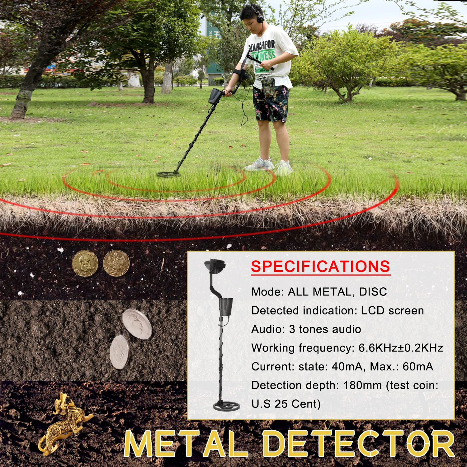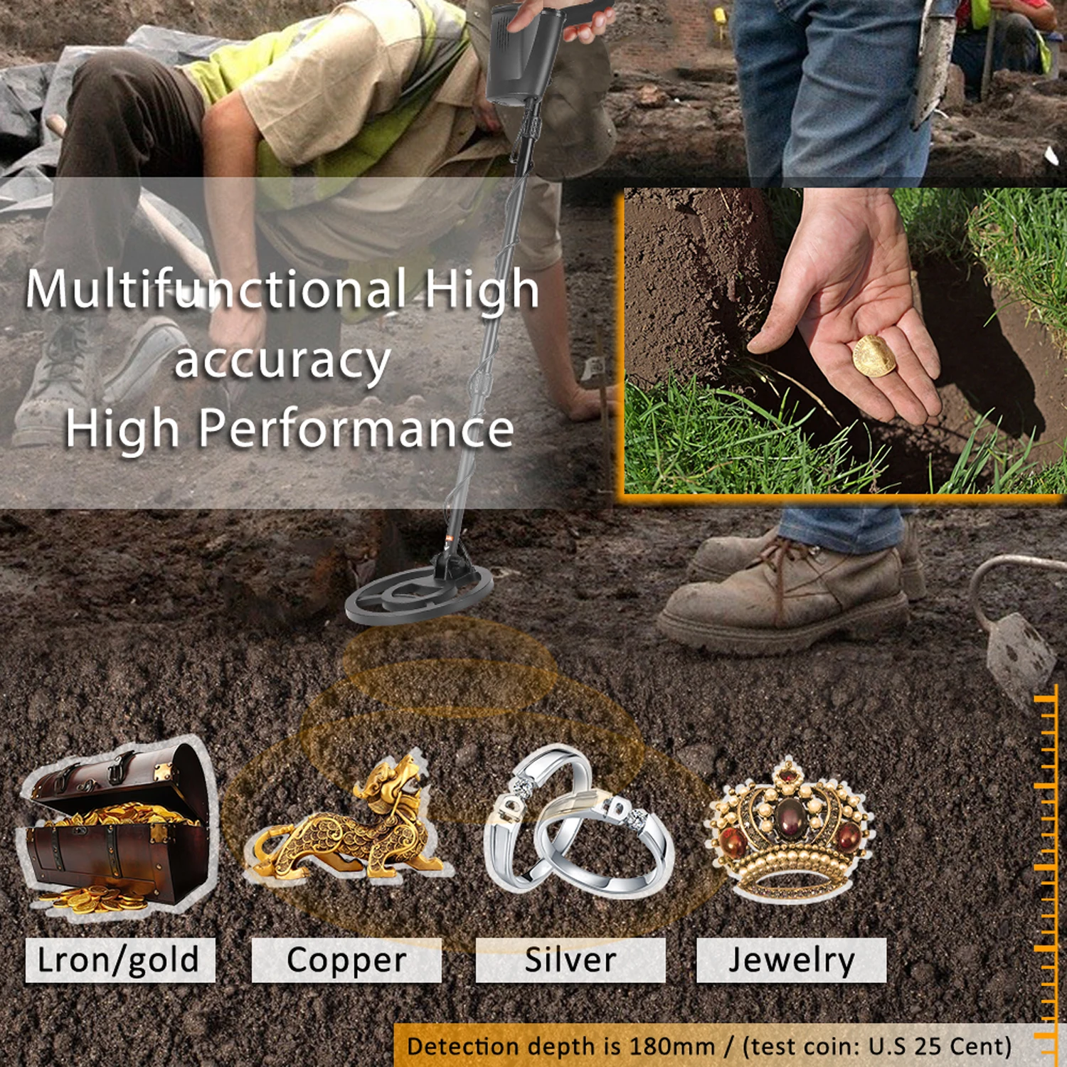 Высокая чувствительность: когда детектор обнаруживает металл, звуковой сигнал и светильник загорится, чтобы предупредить вас, можно использовать для поиска золотых и серебряных ювелирных изделий, монет и других металлов на полу. Он очень подходит для поиска металлических предметов и в любом месте, где вам нужно обнаруживать металлы. Глубина обнаружения составляет 180 мм/испытательная Монета: США 25 процентов).