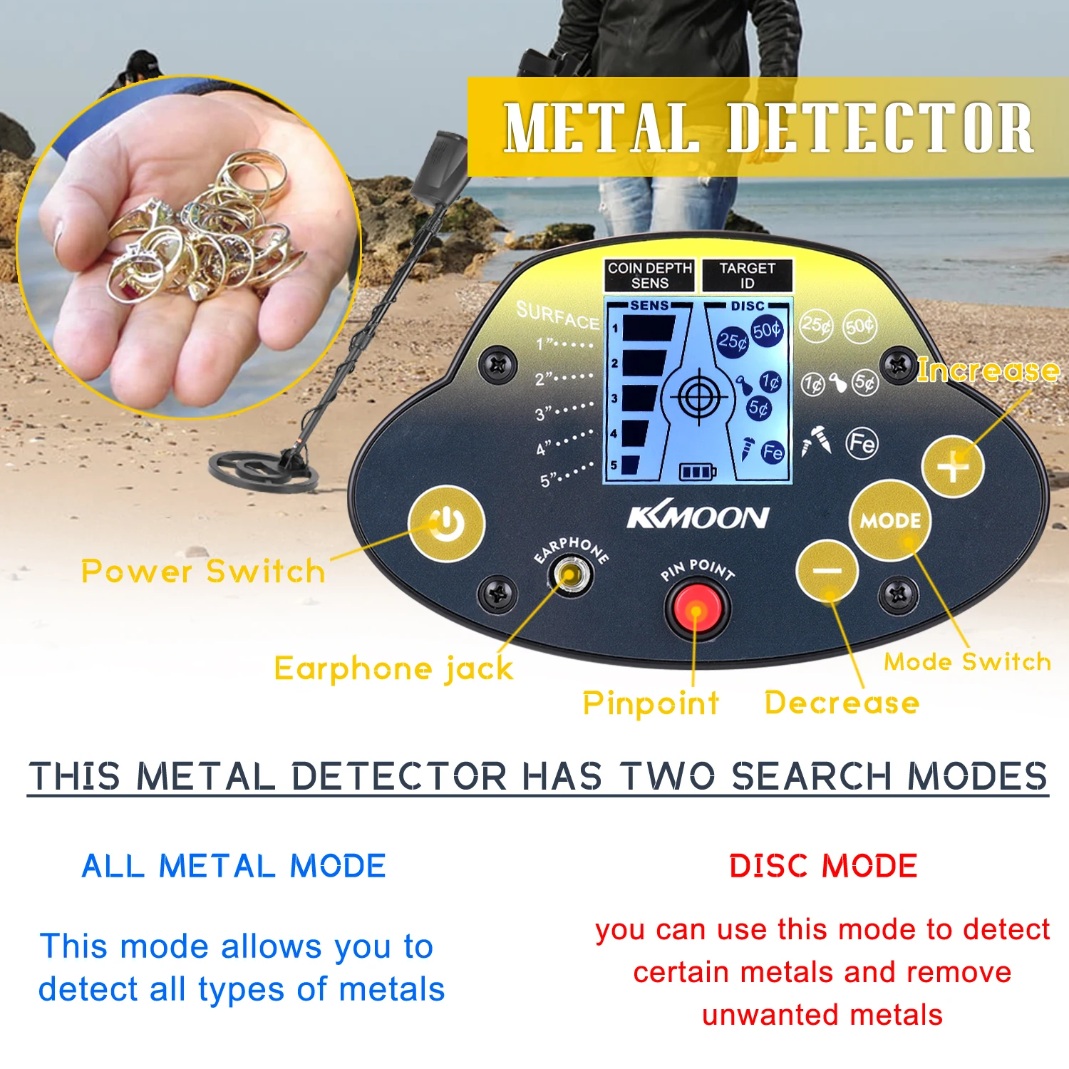 Два режима обнаружения: Этот металлоискатель имеет два режима поиска: полностью металлический режим и дисковый режим. Все металлы: этот режим позволяет обнаруживать все типы металлов. Диск: вы можете использовать этот режим для обнаружения определенных металлов и удаления нежелательных металлов.