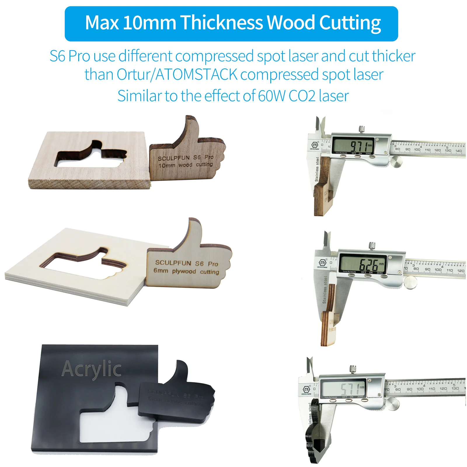 1. 60 Вт световой эффект уникальном месте сжатия лазера: S6 pro использует самую последнюю 5,5 Вт диод пятно сжатия лазера. Он имеет ультратонкую квадратную лазерную фокусировку и имеет двойное проникновение и точность резки обычных лазеров. Даже в области точечных компрессионных лазеров S6 pro имеет более тонкие гравировальные отметки и более сильные возможности резки и проникновения. Он может резать деревянные доски толщиной 10 мм и гравировать керамику и металлы, что почти выходит за рамки лазера СО2 мощностью 60 Вт.